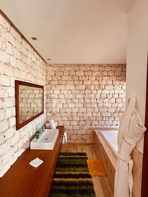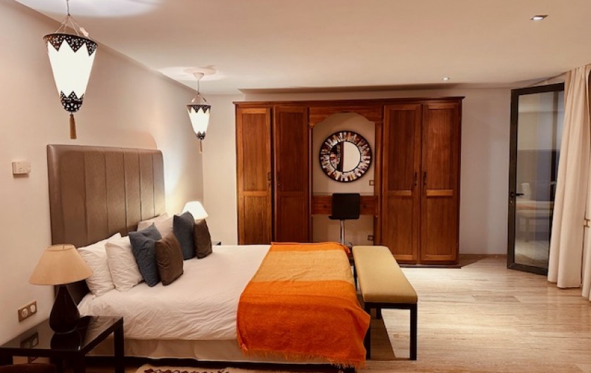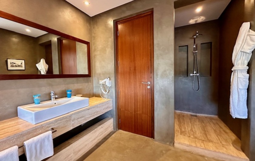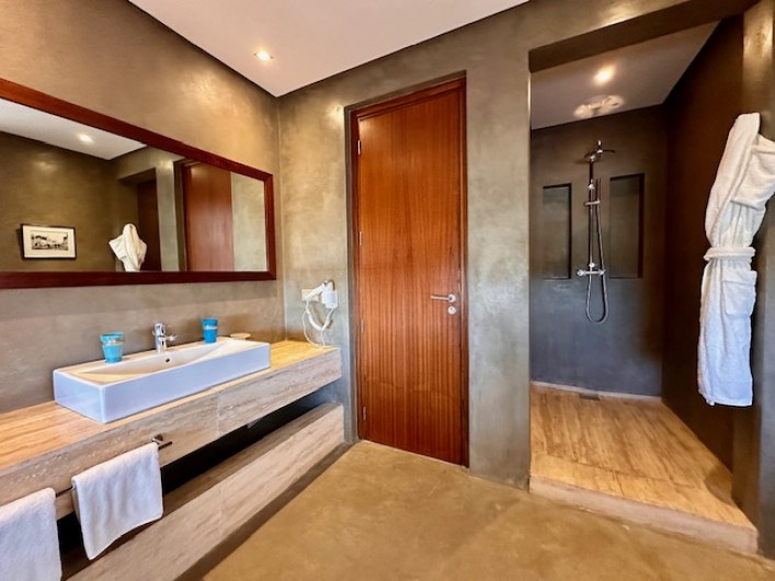 Chaque chambre dispose de larges salles de bain, de couchages de qualité, de téléviseurs et de terrasses ouvertes sur l’infini. Dans chacune de ces pièces, l’œil recouvre un accord parfait de tons gais et différents. Sols en marbre, murs de pierre, salle de bain en tadelakdt.