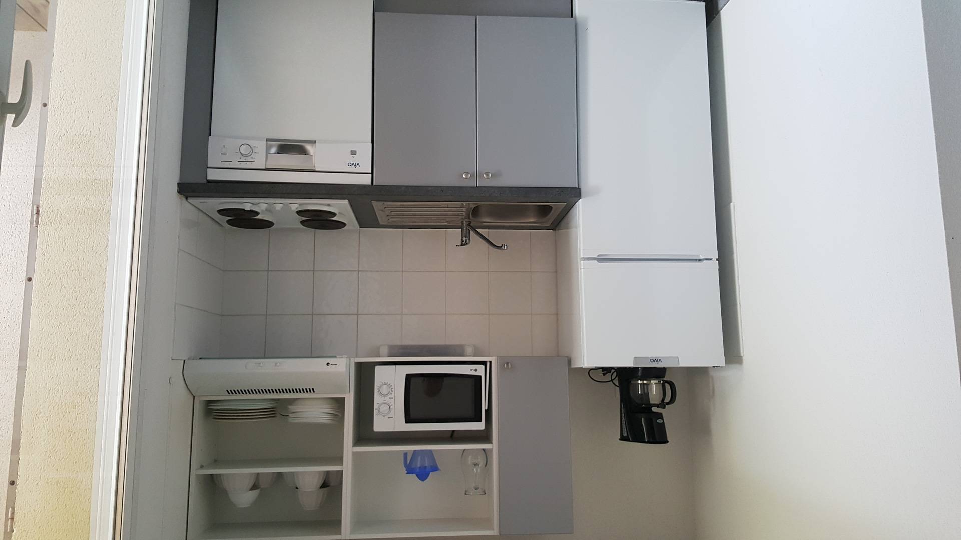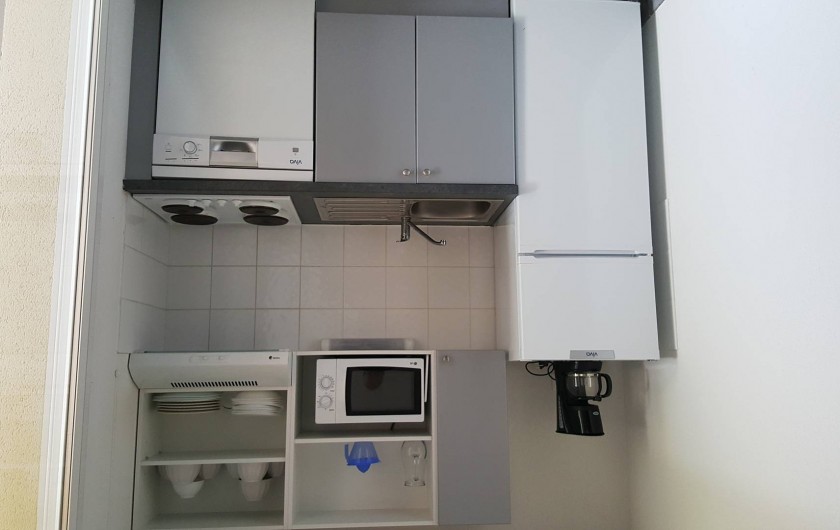 micro-ondes, cafetière, réfrigérateur-congélateur, meubles de rangement, vaisselle, donnant sur une terrasse avec salon de jardin.