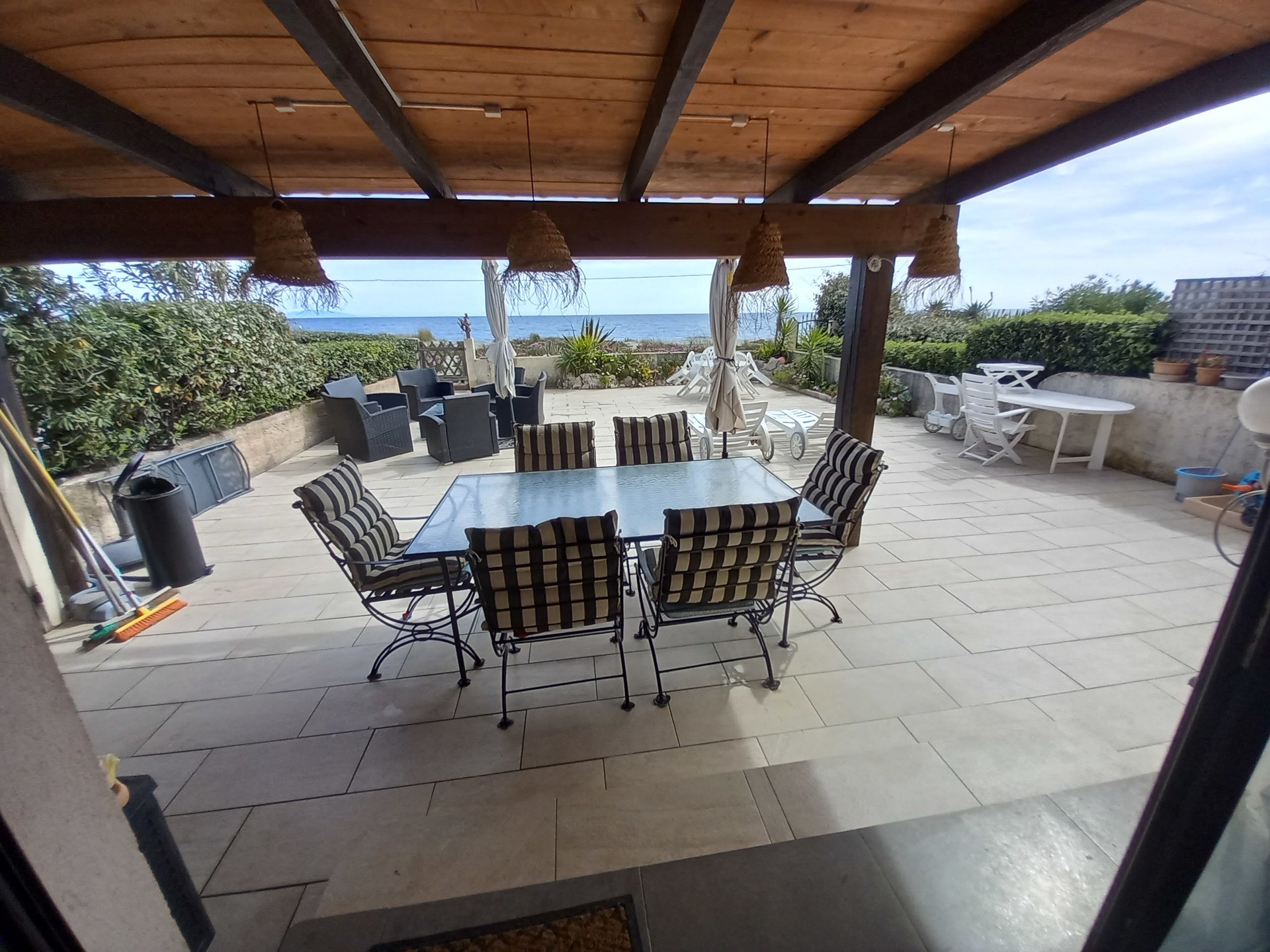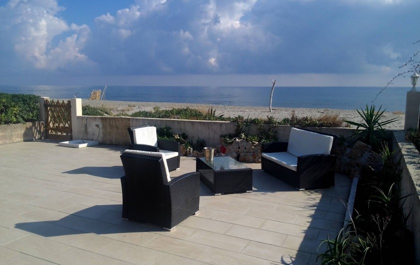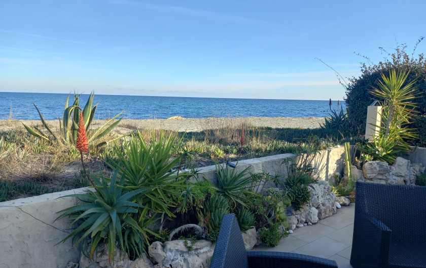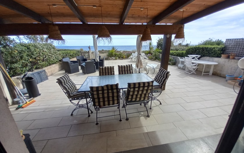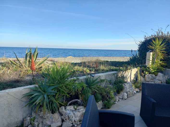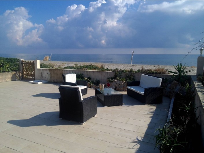 grande terrasse de plus de 100 m2 devant la mer avec portillon d'accès sur la plage privée