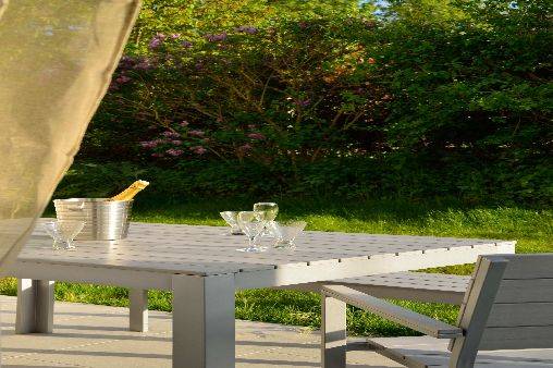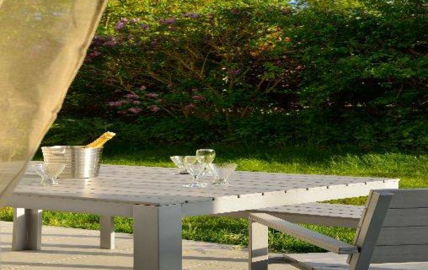 Dans le jardin: Salon de jardin sous sa voile d'ombrage, chaises longues, barbecue.