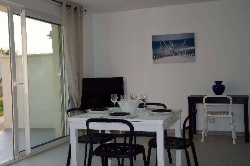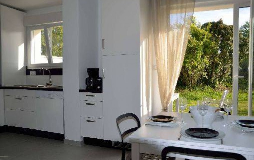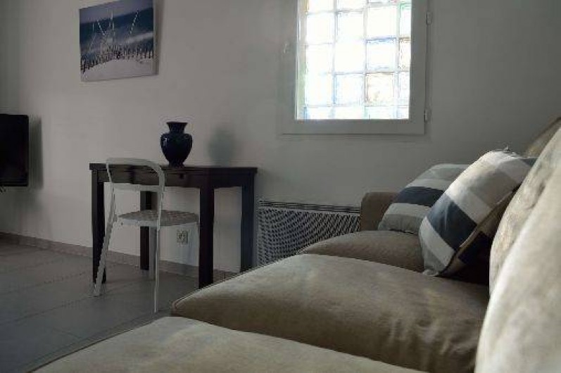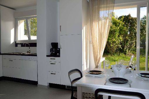Au rez de jardin, cuisine intégrée complétement équipée, coin repas, salle d'eau, salon : canapé convertible (couchage: 160x200), TV-HD (107cm), Blu-Ray, Hifi, Wifi.