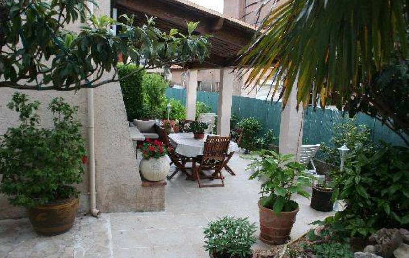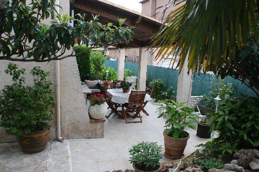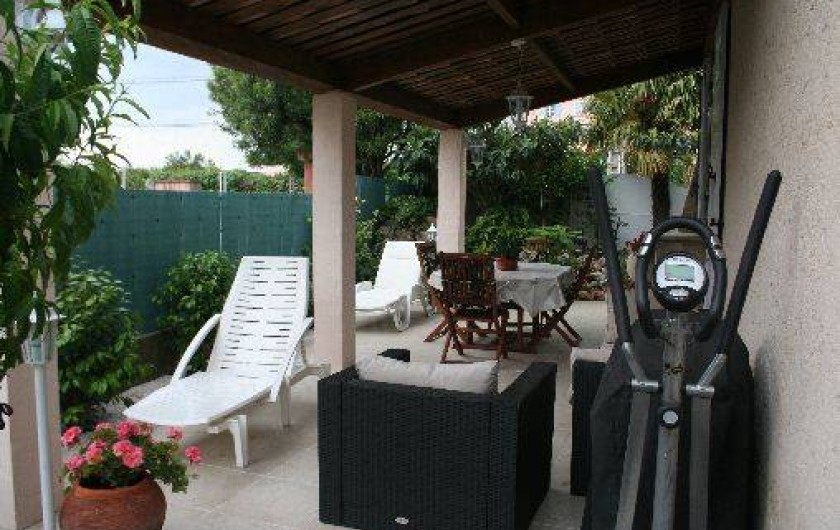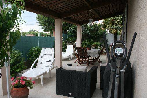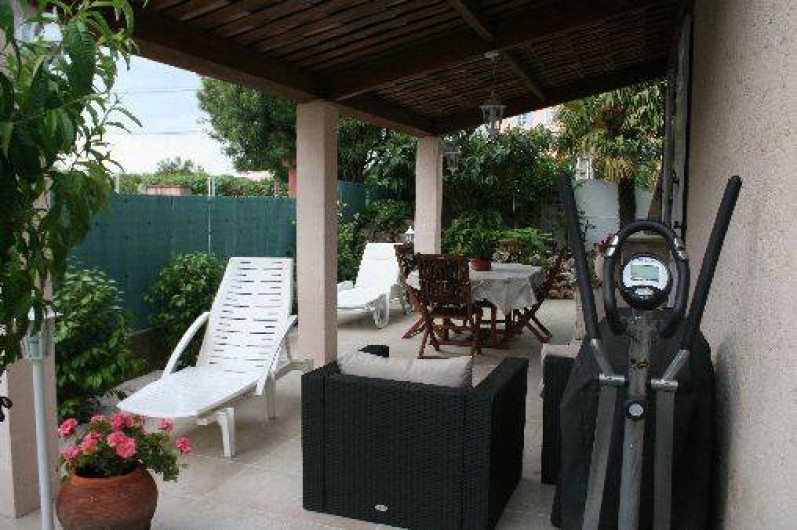 Terrasse de 35 m2 couverte : table, chaises, salon de jardin (canapé 3 places avec coussins, fauteuil avec coussins), transats avec matelas, barbecue, parasol, appareil de musculation. Bassin avec cascade alimentant les poissons rouges.