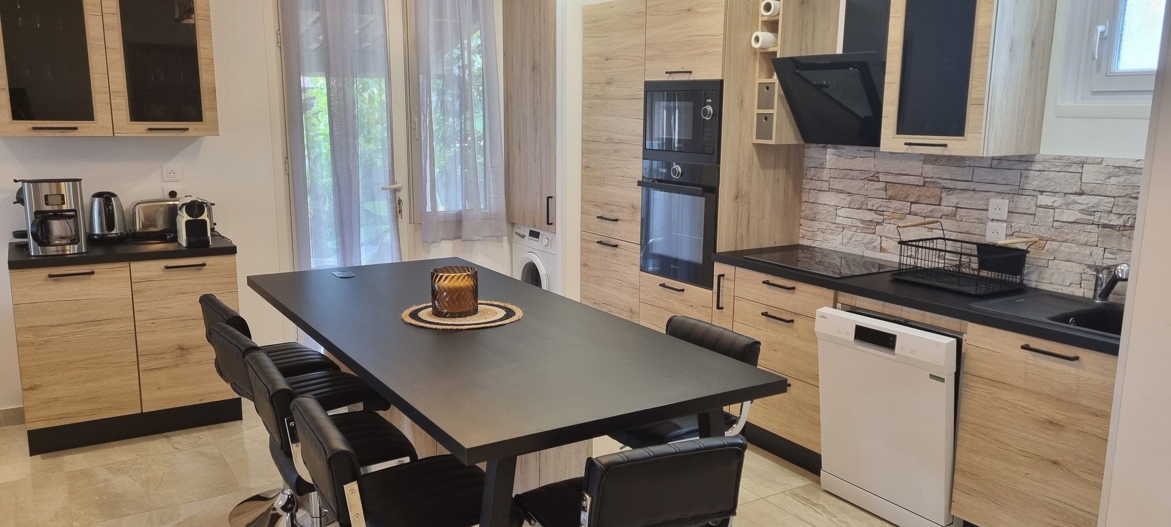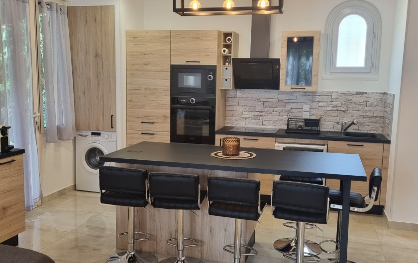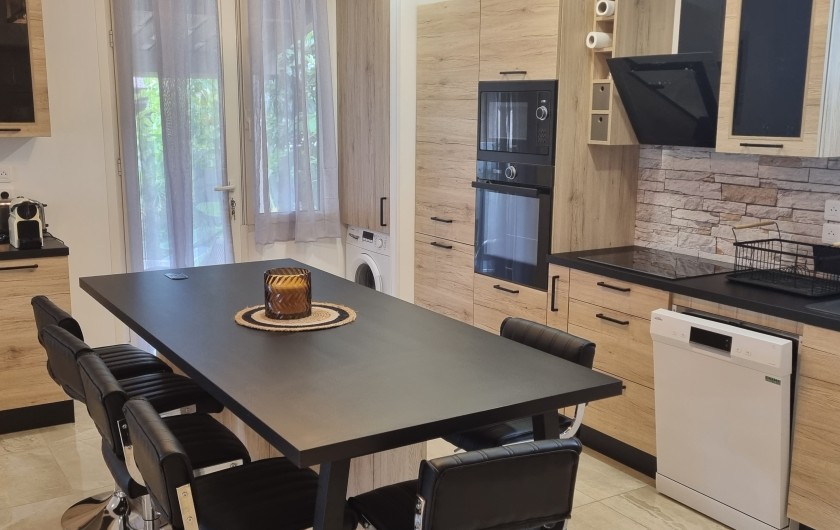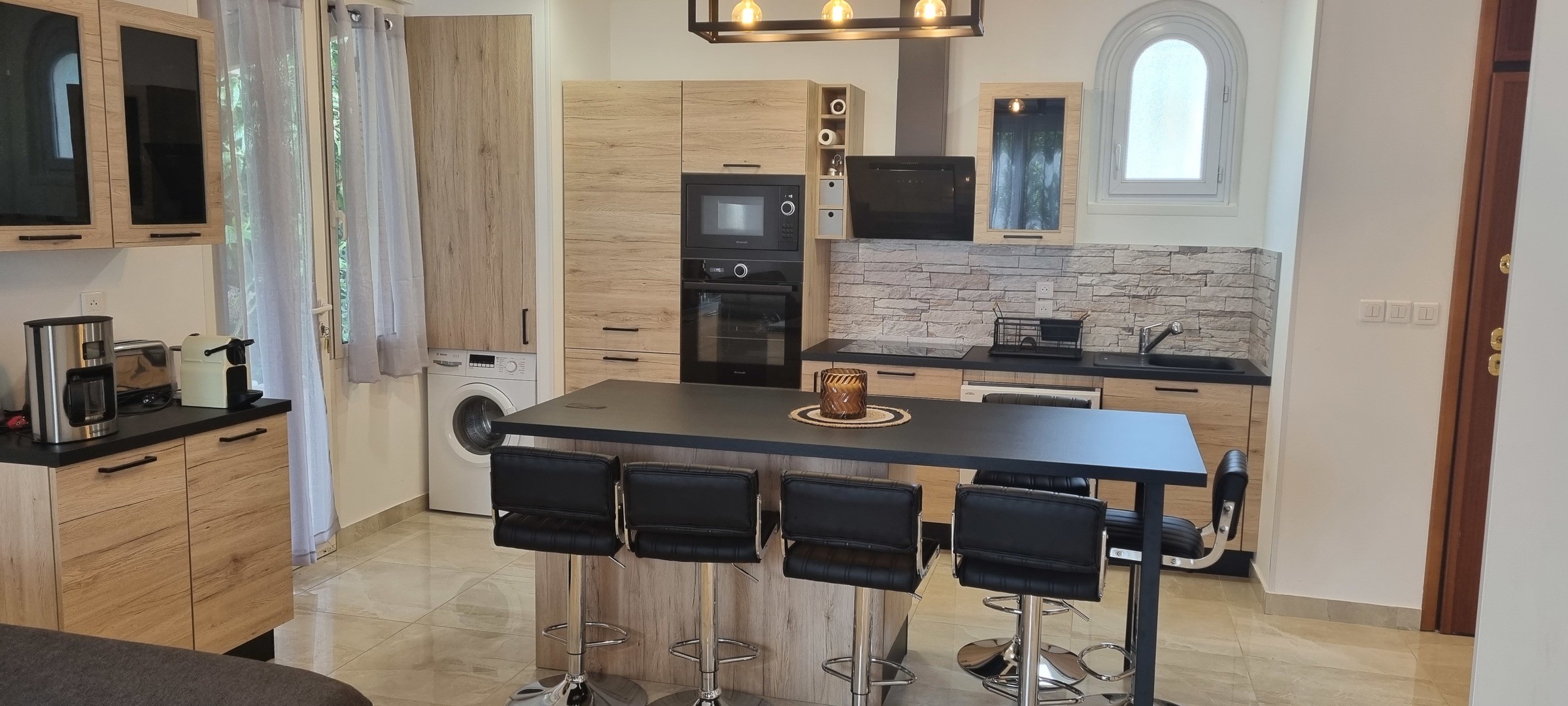 cuisine avec îlot central avec rangement et grand tiroir, 6 tabourets réglables, plaque à induction, hotte aspirante, frigidaire avec congélateur, machine à laver le linge, machine à laver la vaisselle, Four micro-ondes