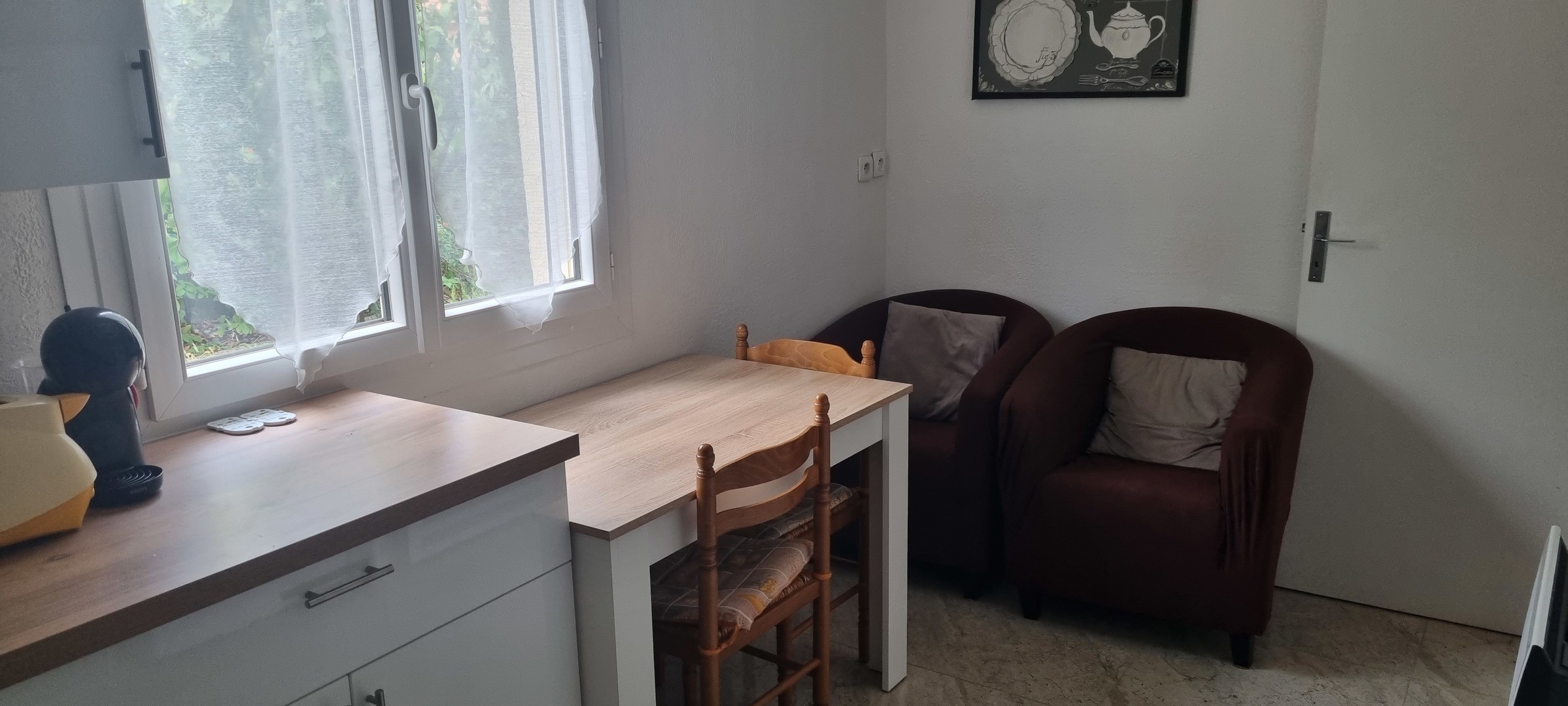 Il se compose d’une CUISINE équipée avec fenêtres en PVC double vitrage donnant sur le jardin, et moustiquaires