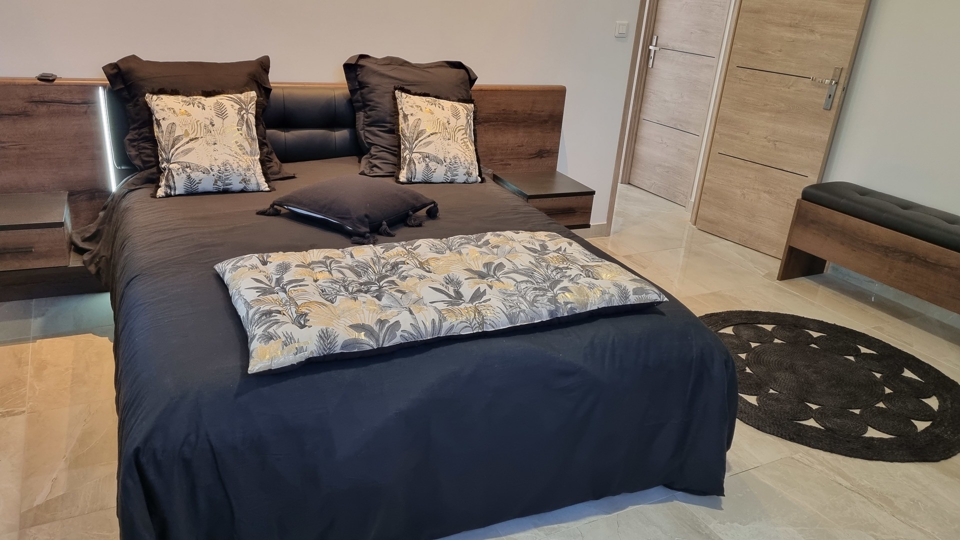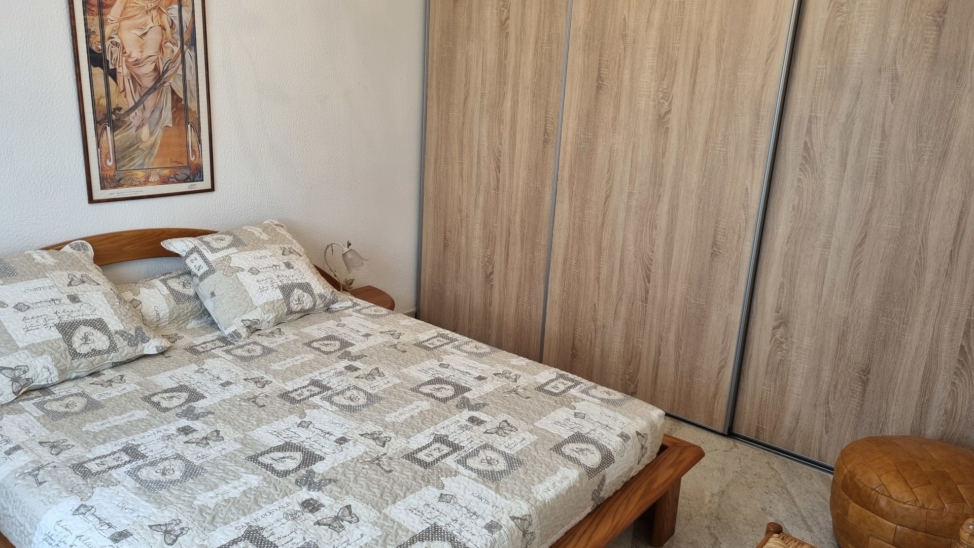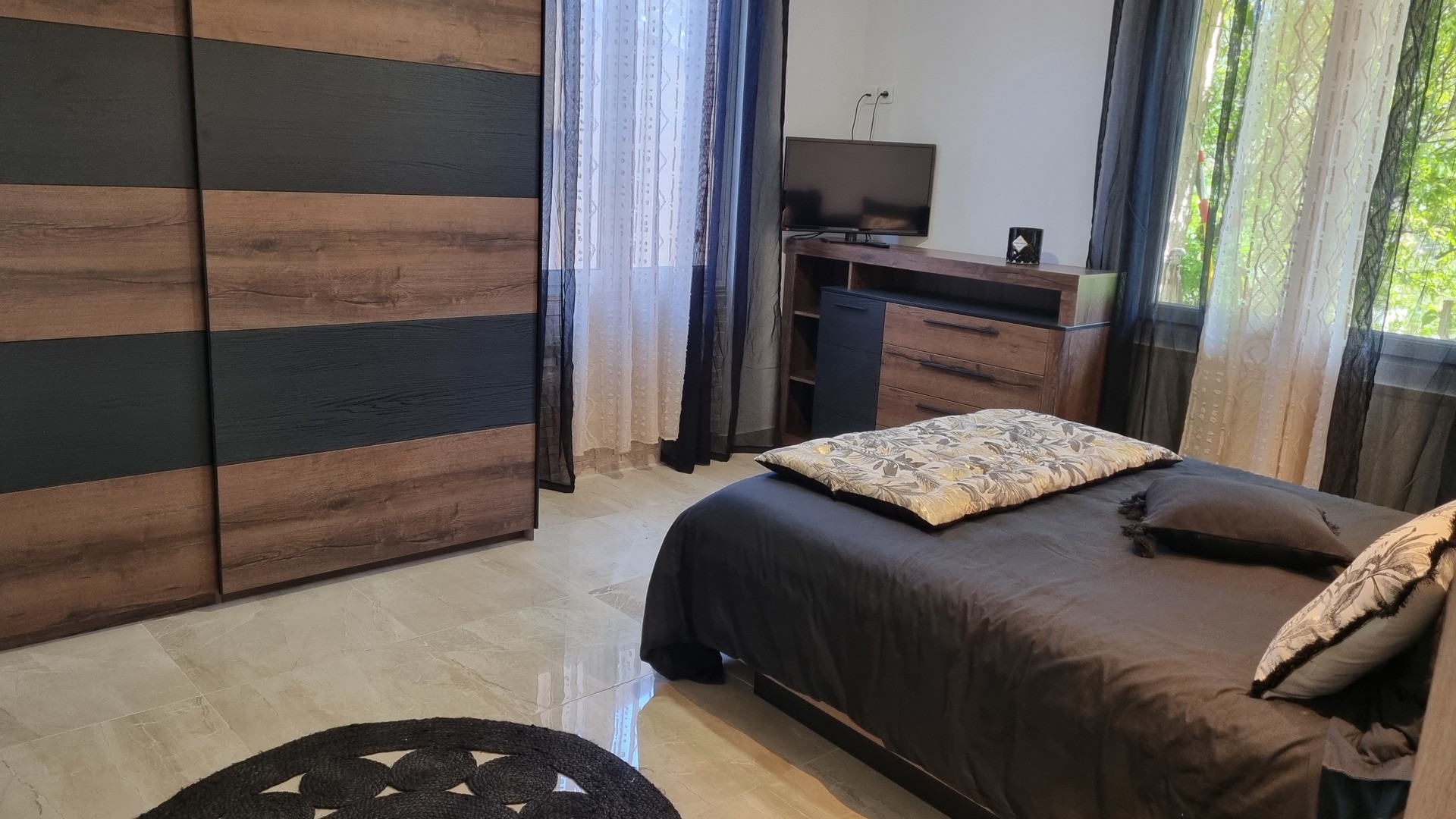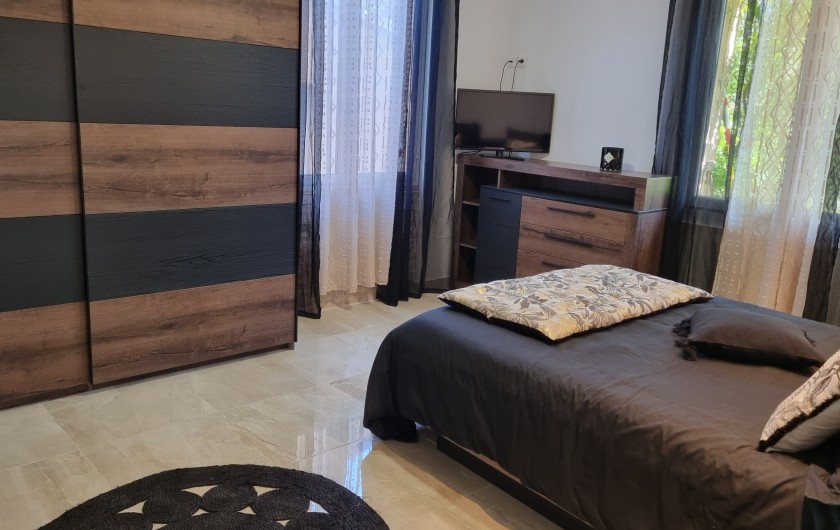 Chambre à coucher 1 : lit en 160 cm matelas à mémoire de forme, armoire style dressing, commode, téléviseur