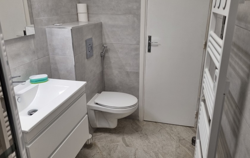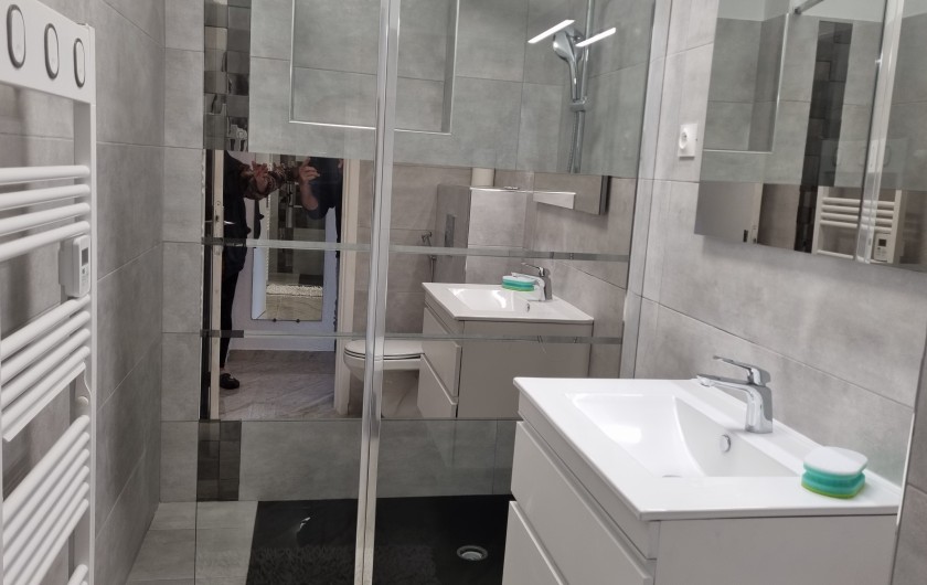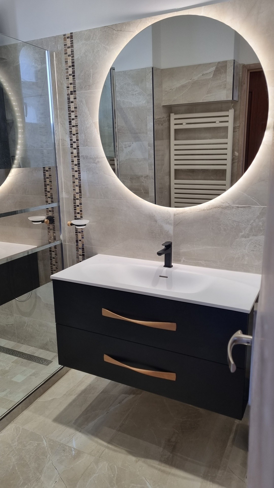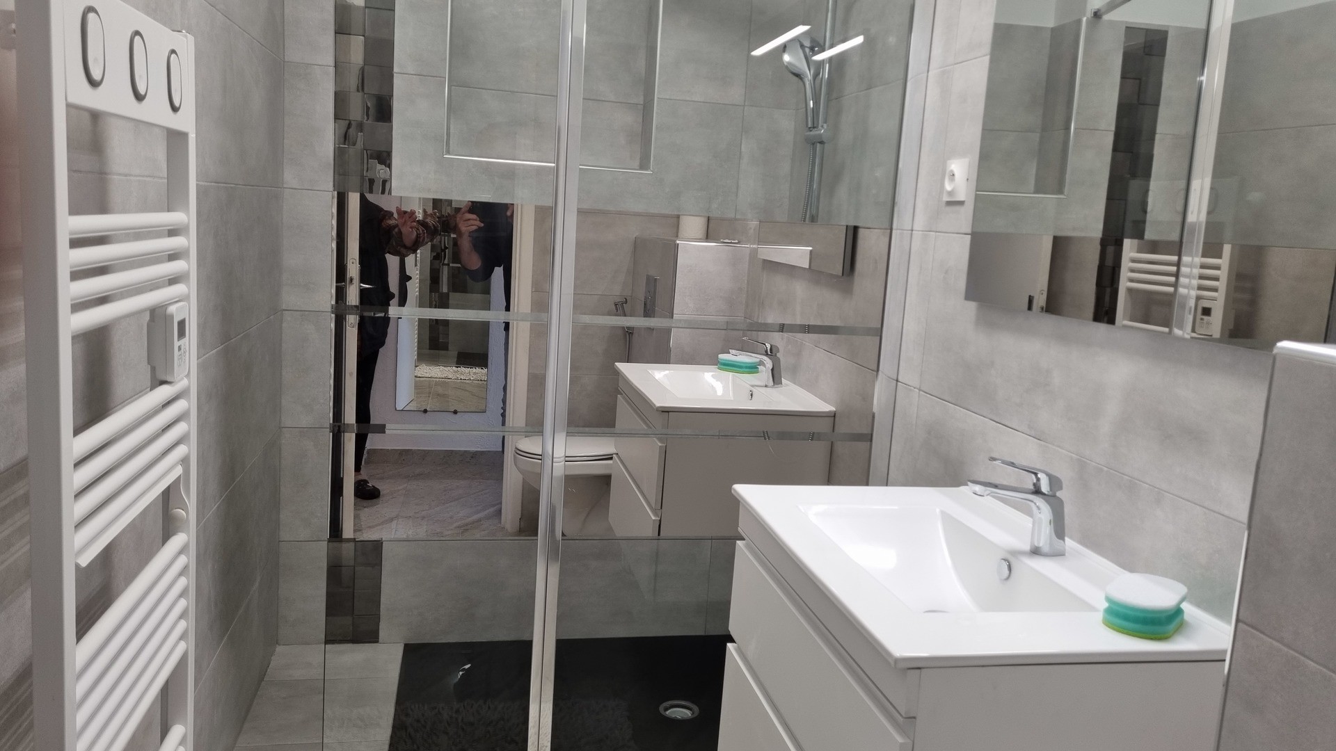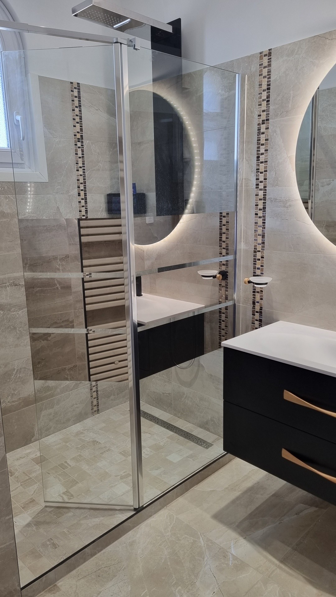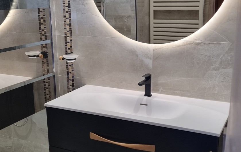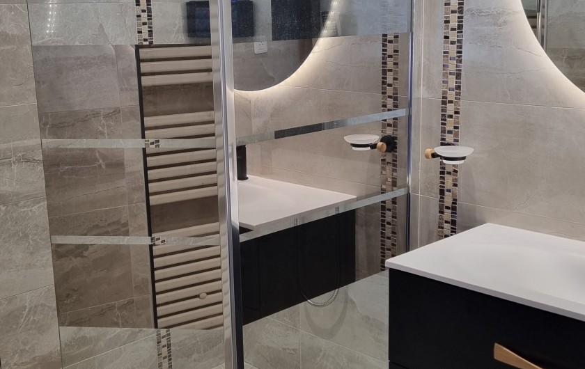 Salle d'eau à l'italienne ,meuble avec lavabo, miroir, sèche serviettes,