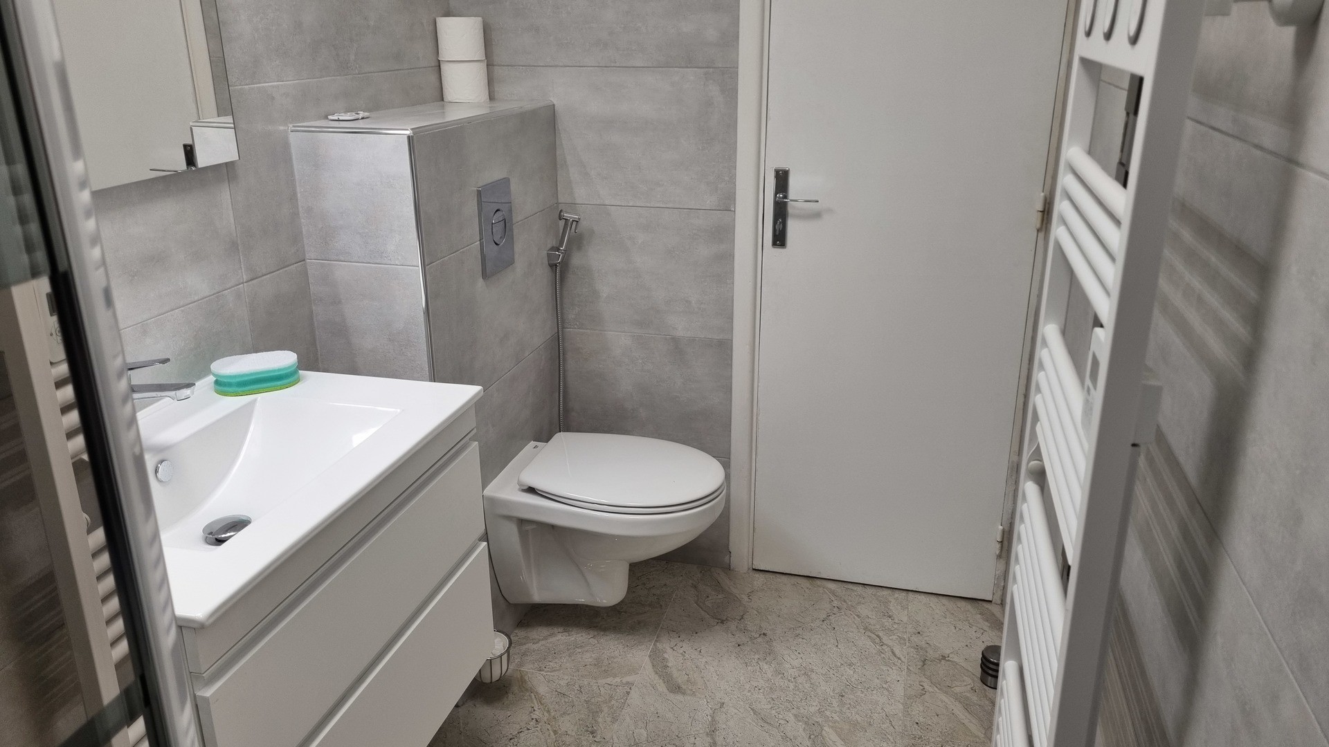 SALLE d'eau à l'italienne WC suspendu, Douche, meuble avec lavabo, miroir, sèche serviettes,