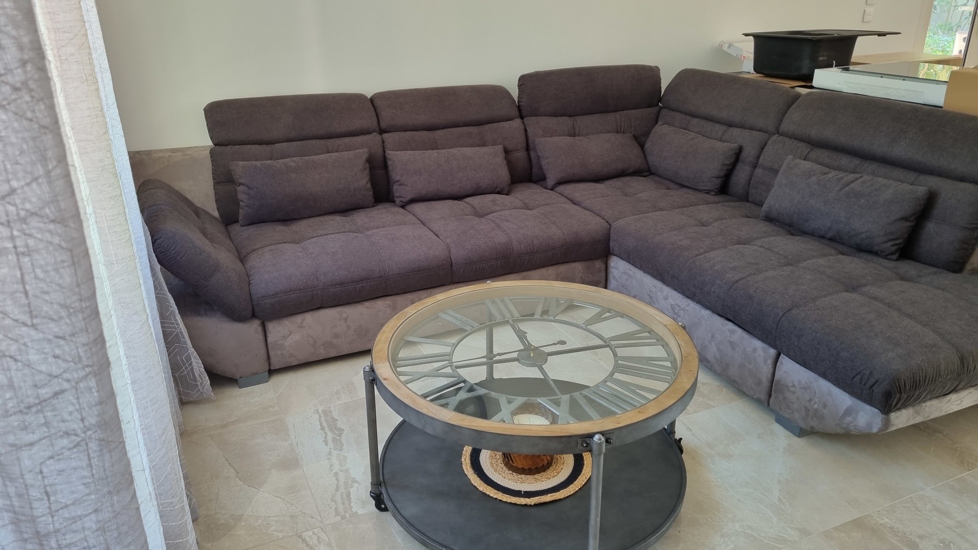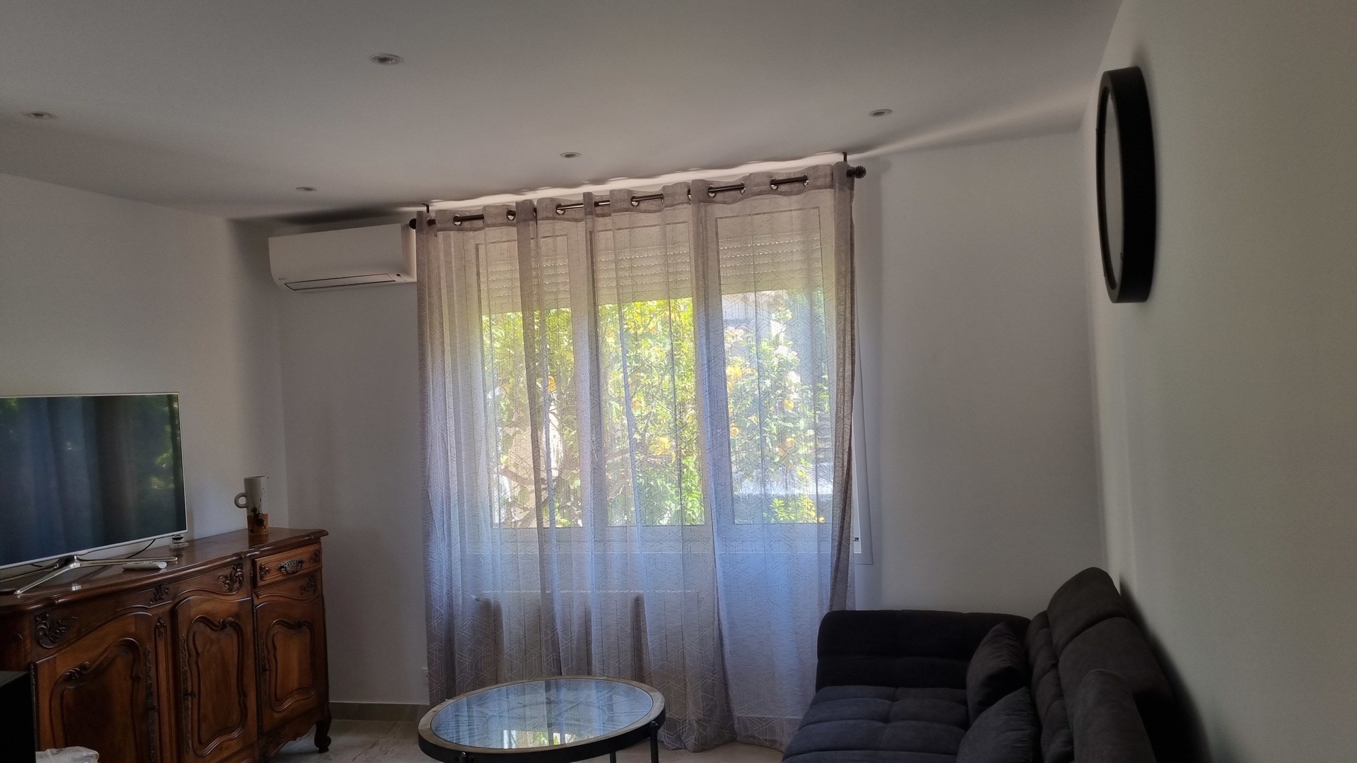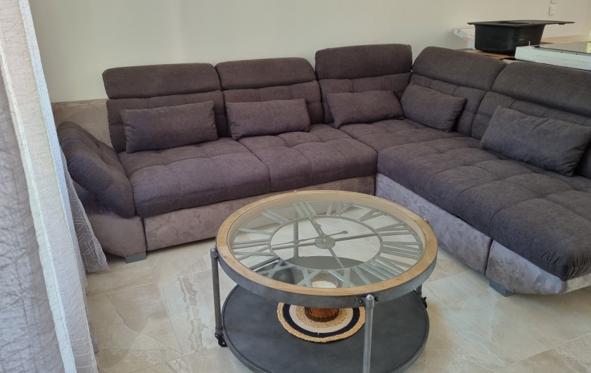 salon avec canapé d'angle, bahut, téléviseur, table de salon, pendule,