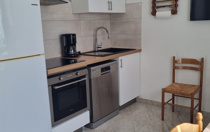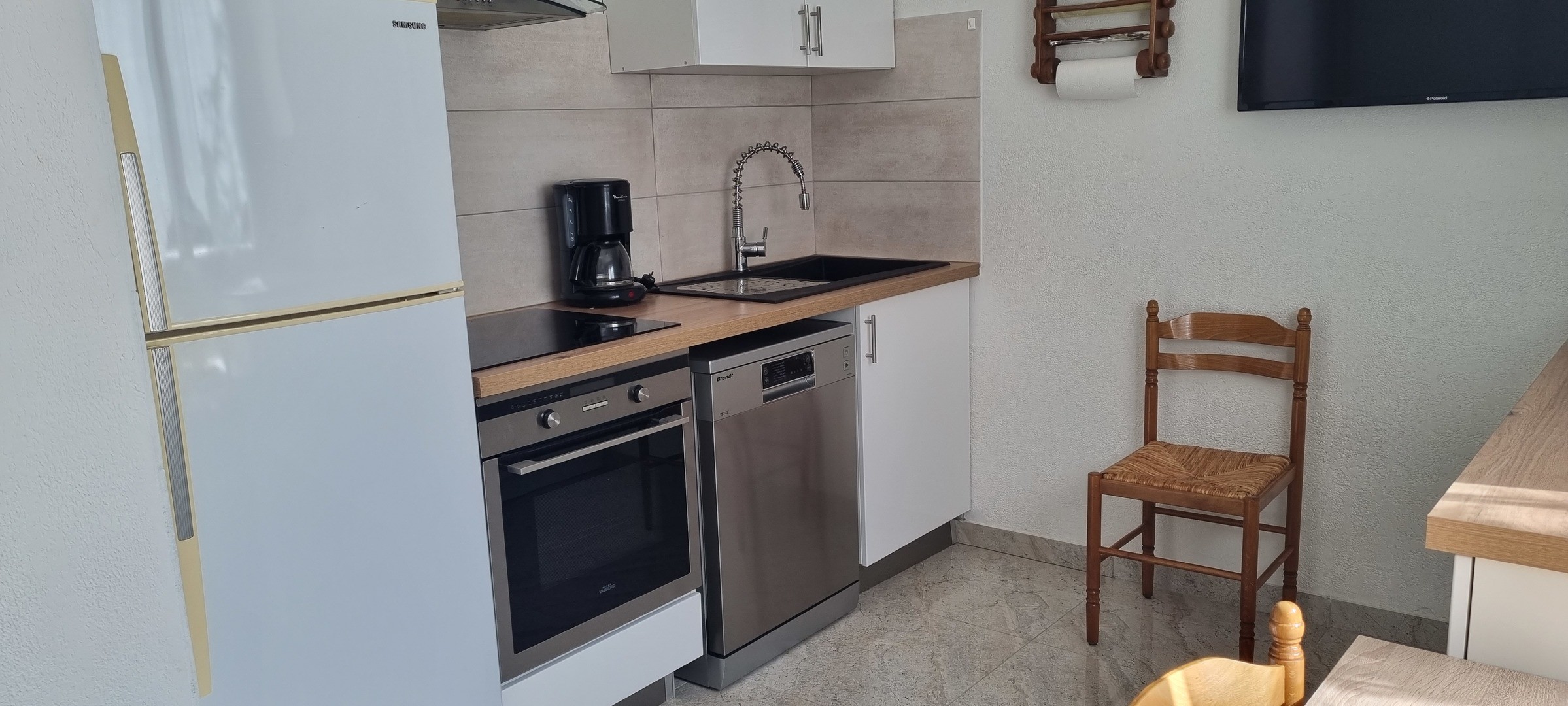 frigidaire avec congélateur, cuisinière plaque à induction, micro-ondes, hotte aspirante avec filtre, meuble avec deux portes au-dessus de l’évier, cafetière,