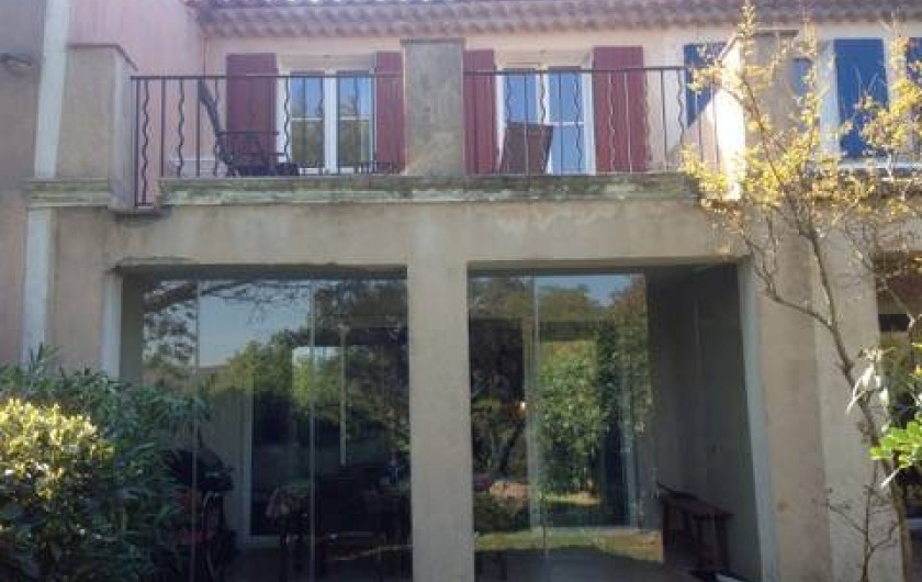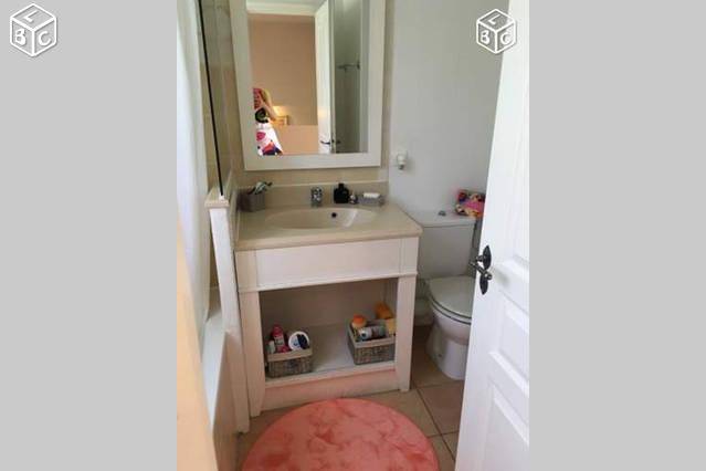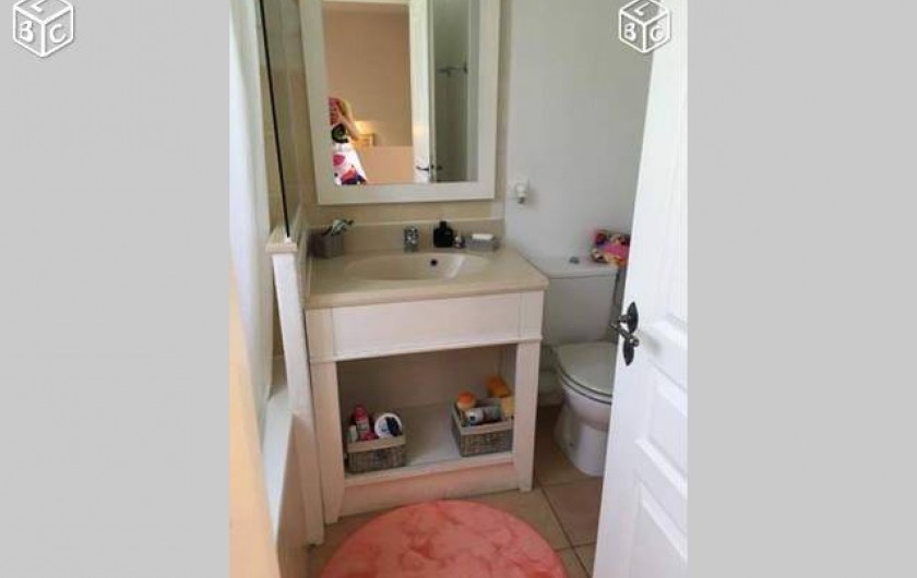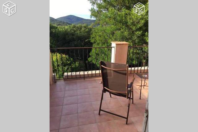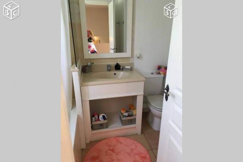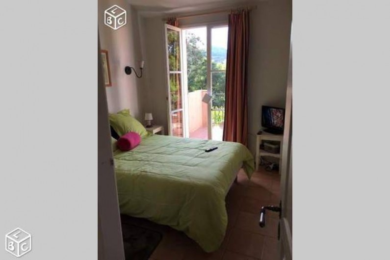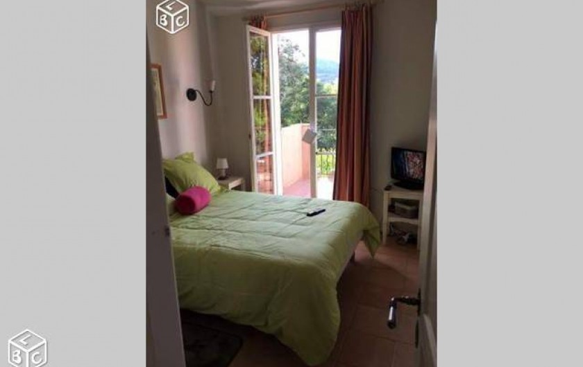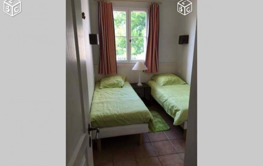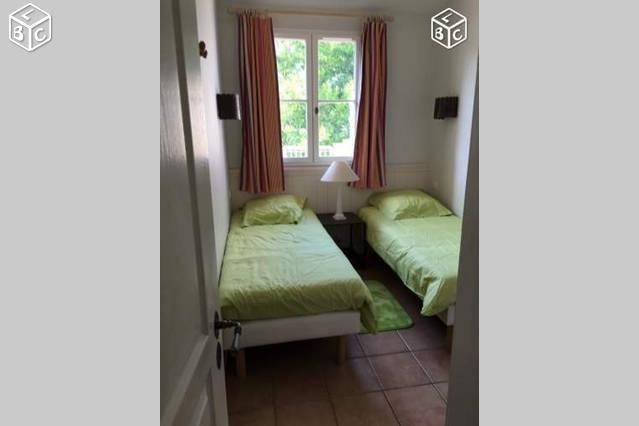 La maison est sur deux étages, en haut une chambre avec lit neuf en 160, porte fenêtre donnant sur une grande terrasse au soleil, télé TNT. Une salle de bain avec baignoire et wc, lavabo une vasque, et une chambre avec deux lits single et fenêtre simple. chaque chambre à un placard.