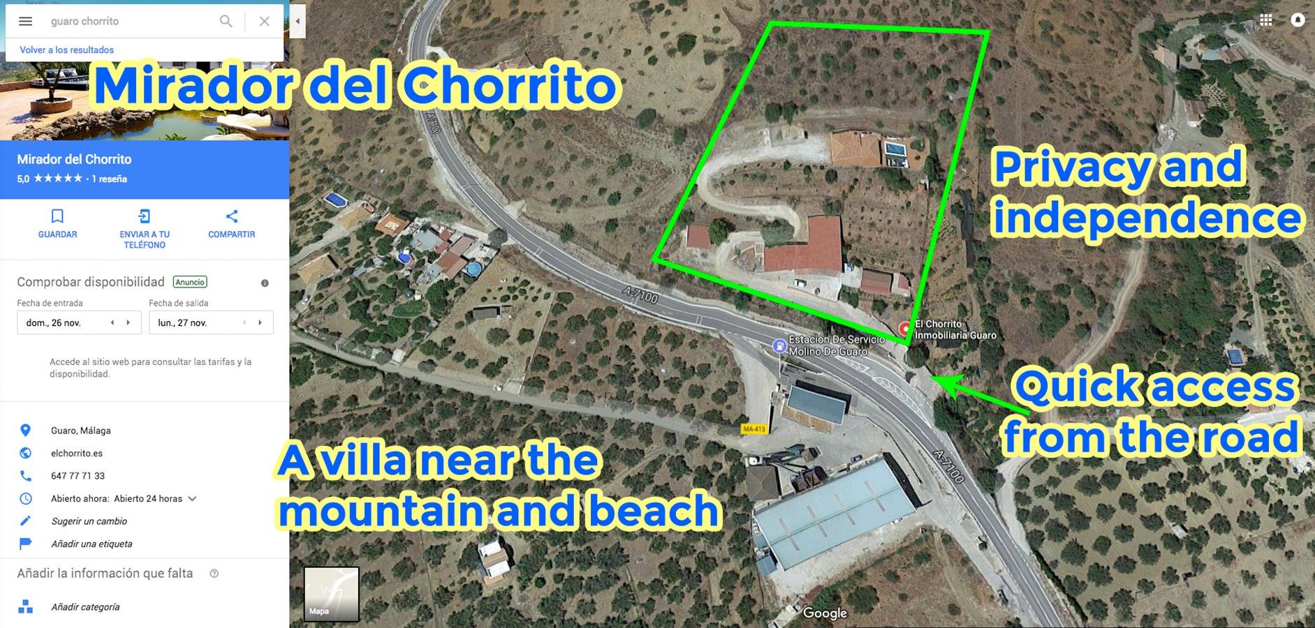 Mirador del Chorrito est une villa de campagne pour 7 personnes avec vue imprenable sur la vallée, il est une belle retraite de vacances près de Marbella en Andalousie. Situé sur le flanc d'une montagne, bien relié et indépendant sans vis à vis. Avec un accès direct depuis la route. La villa se trouve à seulement 45 minutes de l'aéroport international de Malaga, situé dans un village et la plage montagne, à environ 25 minutes près de Marbella et la Costa del Sol.