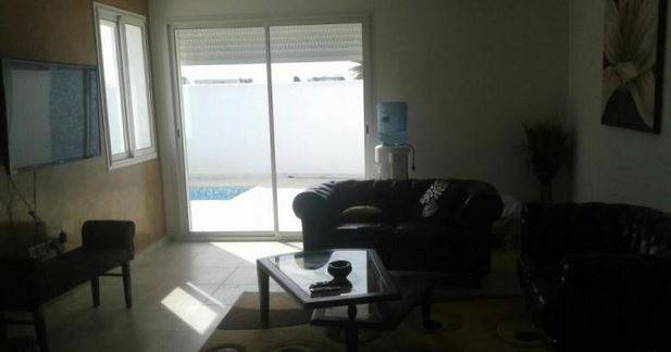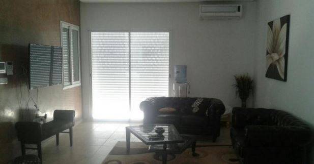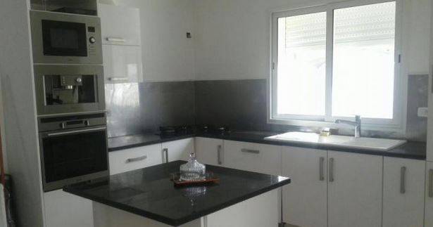 un grand séjour climatisé ouvert sur cuisine équipée ( lave vaisselle, réfrigérateur, plaque à gaz, une machine à café, four et micro