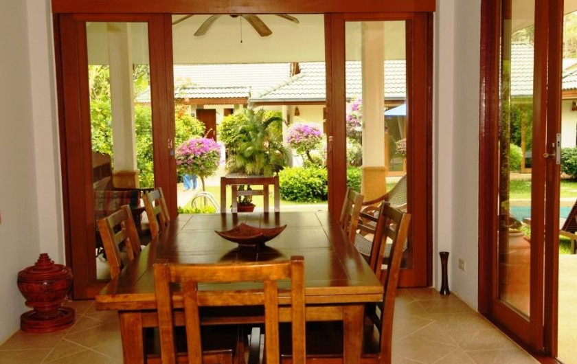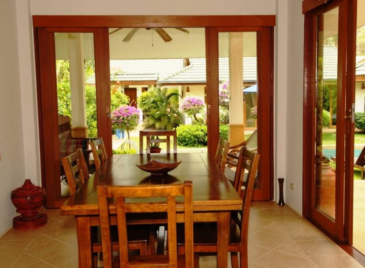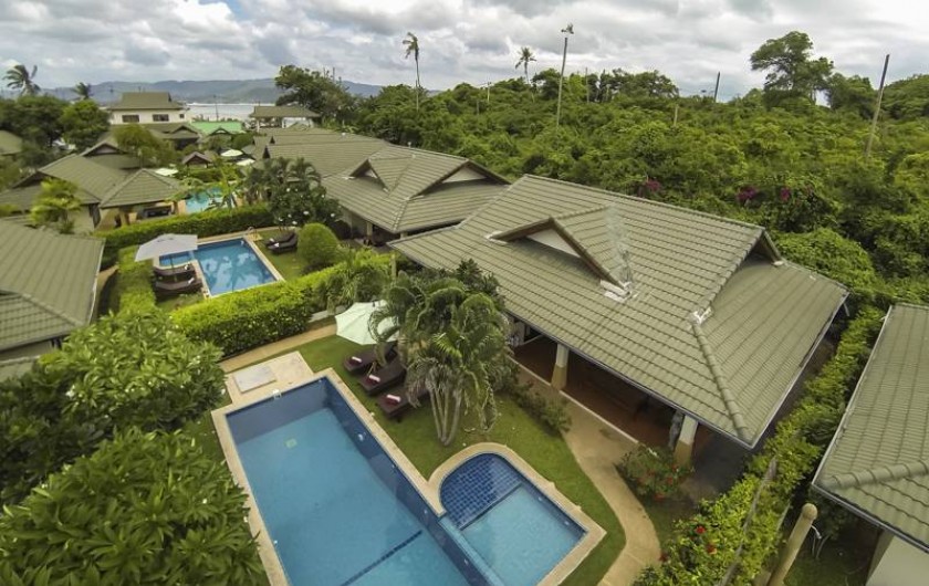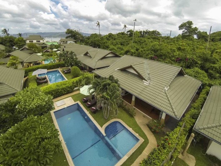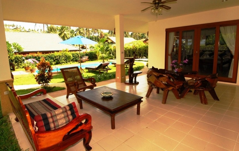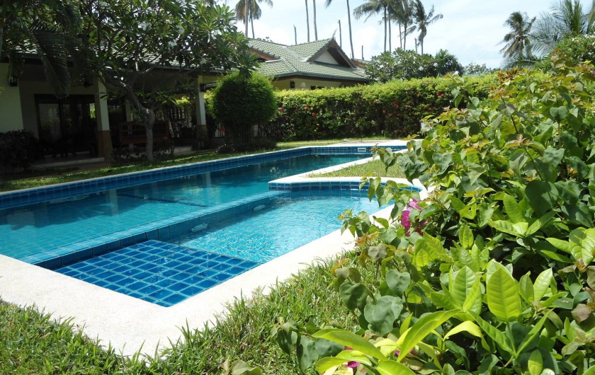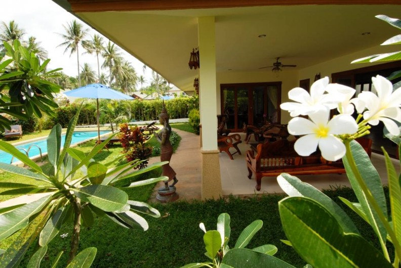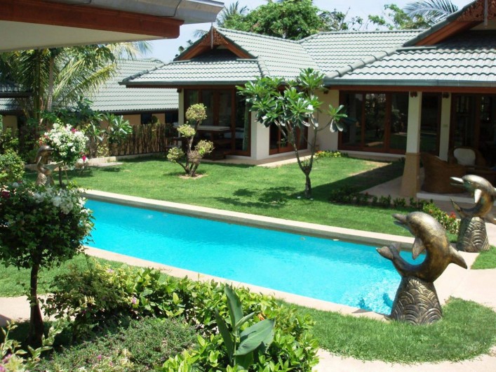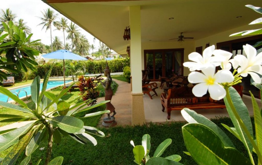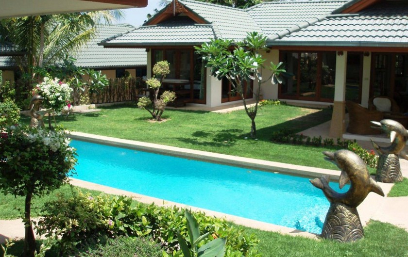 Entre les 2 bâtiments se trouvent le bassin privé et le jardin privé. La station de vacances est localisée sur la Baie de Samrong qui est partagée avec 2 hôtels le Six Hôtel de Sens et à l'hôtel Arayaburi. Ces hôtels ont des restaurants. Mais la station de vacances fournit aussi des repas (à la villa ou sur la plage). Bien sûr de la villa il y a un barbecue.