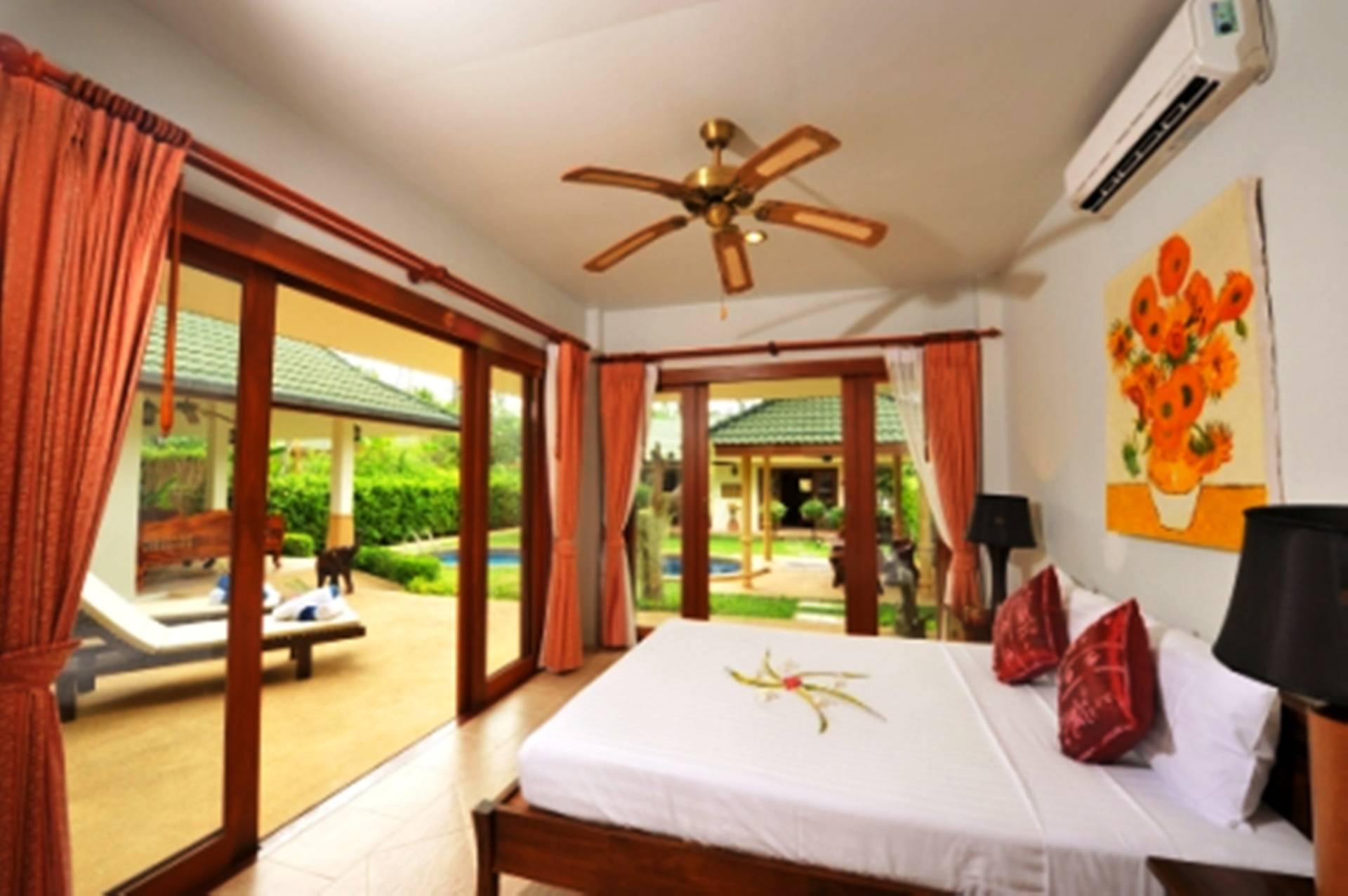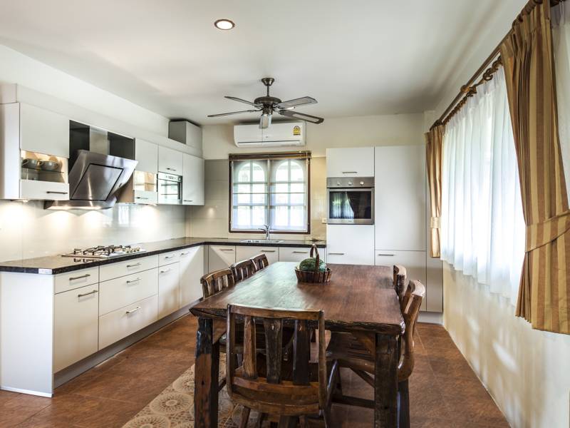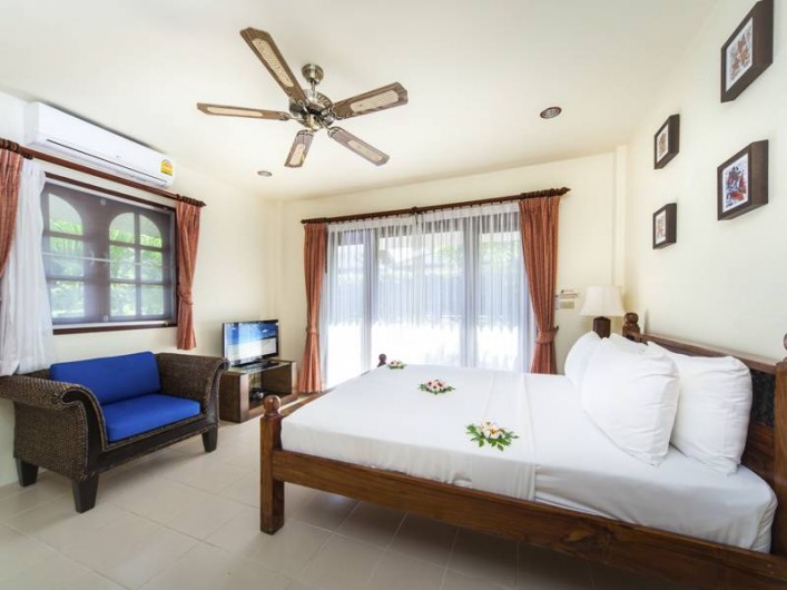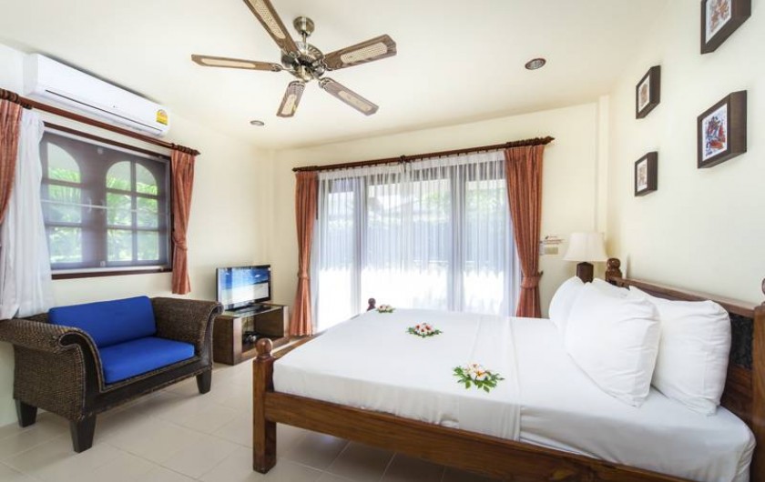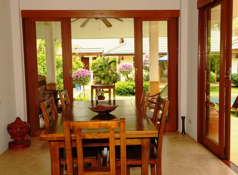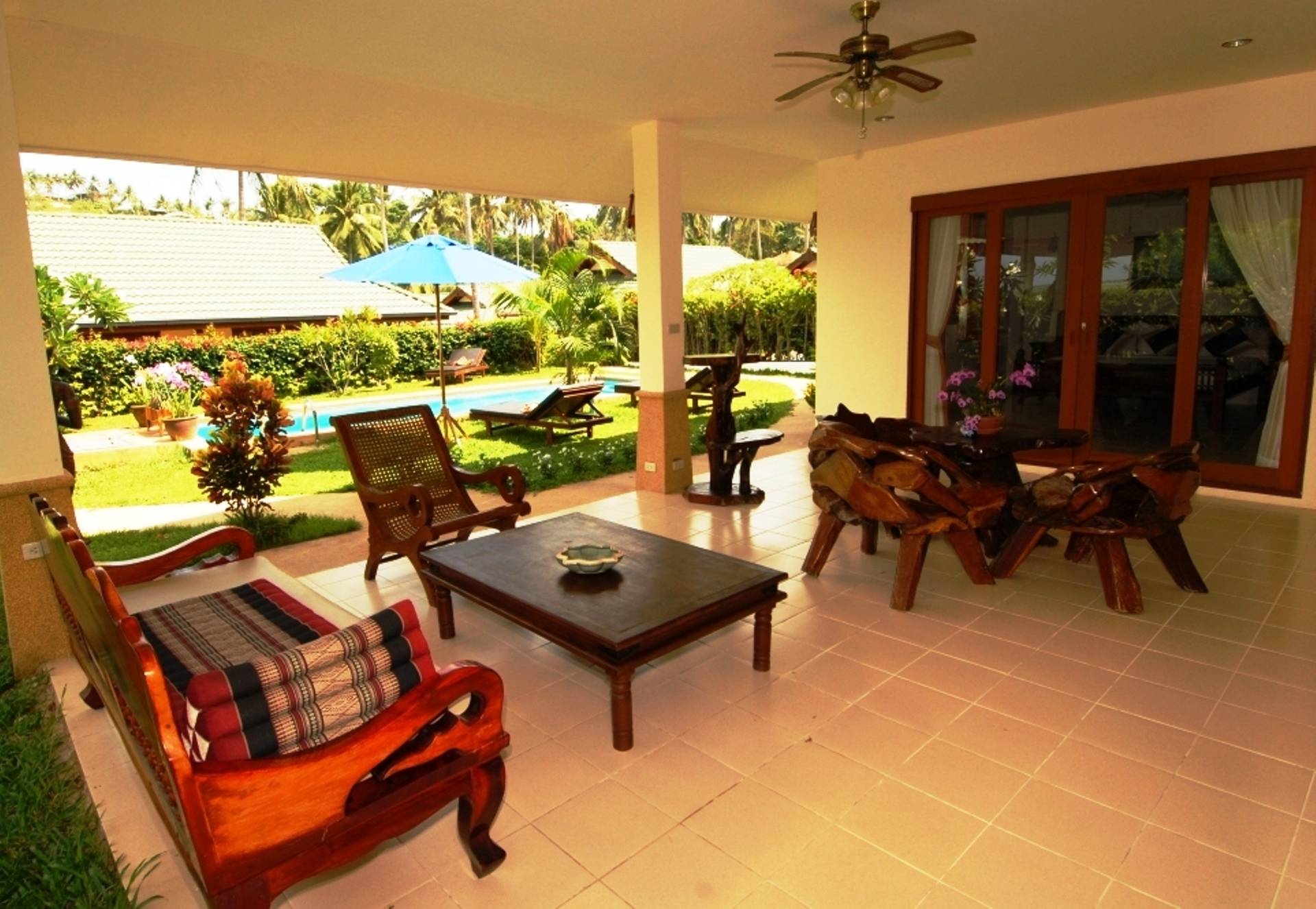 Entre les 2 bâtiments se trouvent le bassin privé et le jardin privé. La station de vacances est localisée sur la Baie de Samrong qui est partagée avec 2 hôtels le Six Hôtel de Sens et à l'hôtel Arayaburi. Ces hôtels ont des restaurants. Mais la station de vacances fournit aussi des repas (à la villa ou sur la plage). Bien sûr de la villa il y a un barbecue.