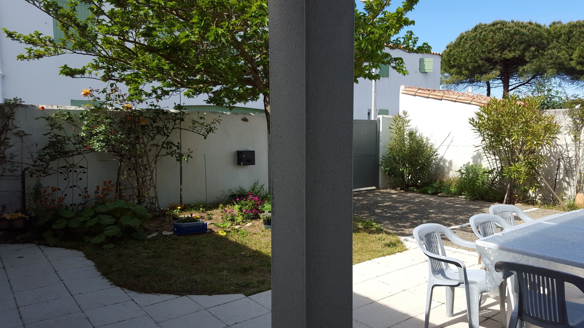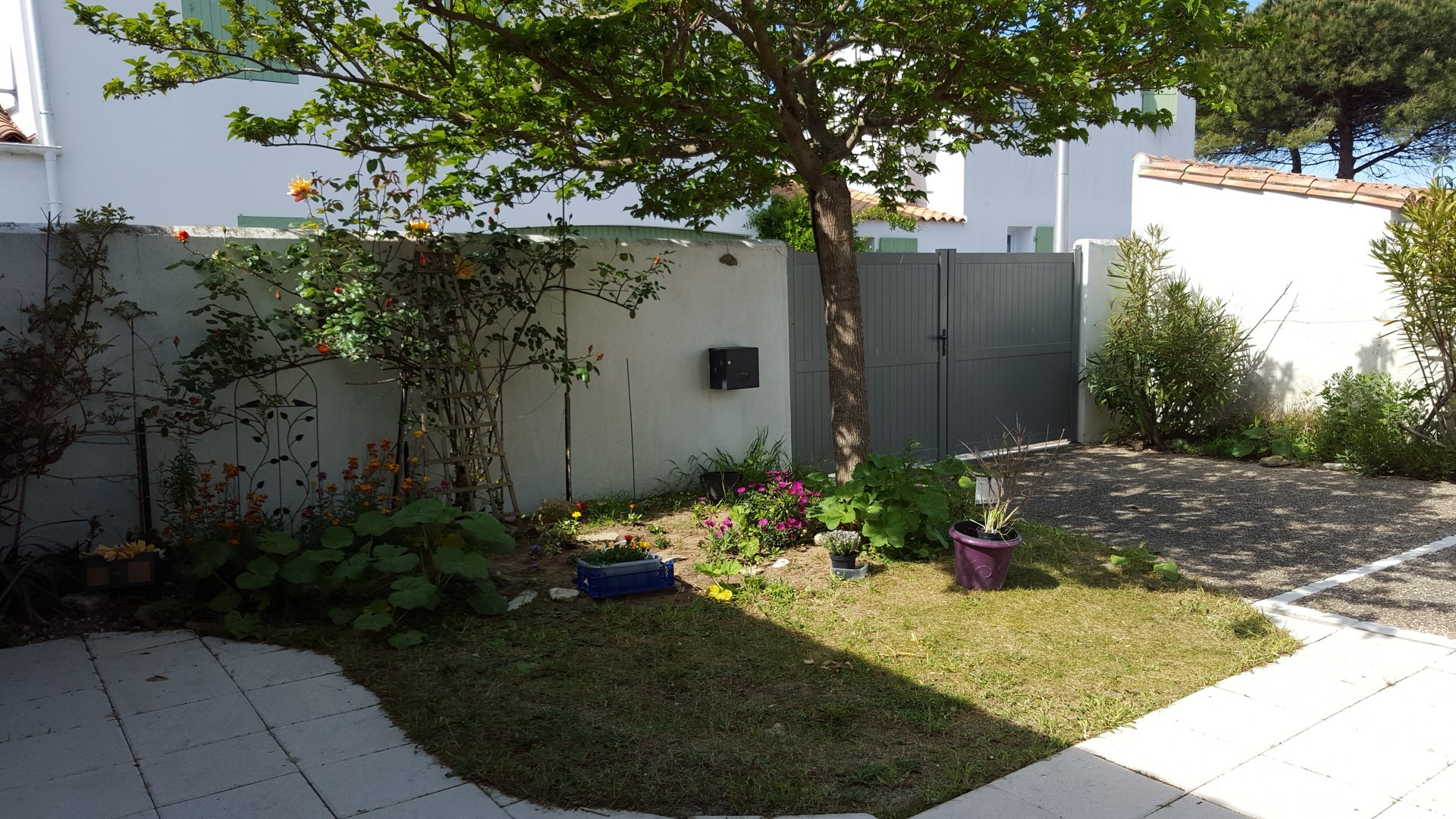 Jardin de 700 M2 clos de murs, en deux parties: devant avec terrasse; derrière plus grand avec barbecue et possibilité garer voiture