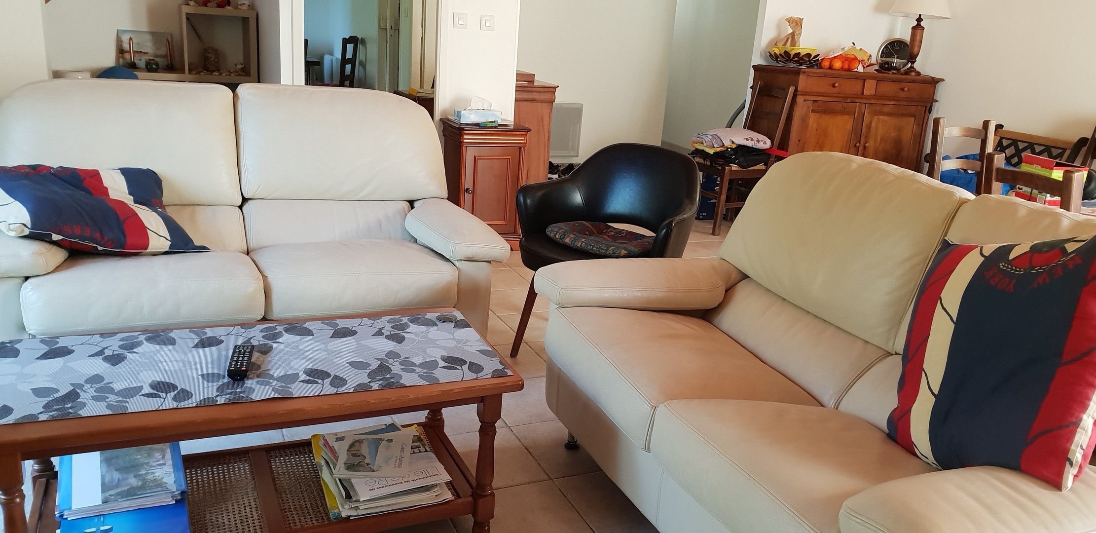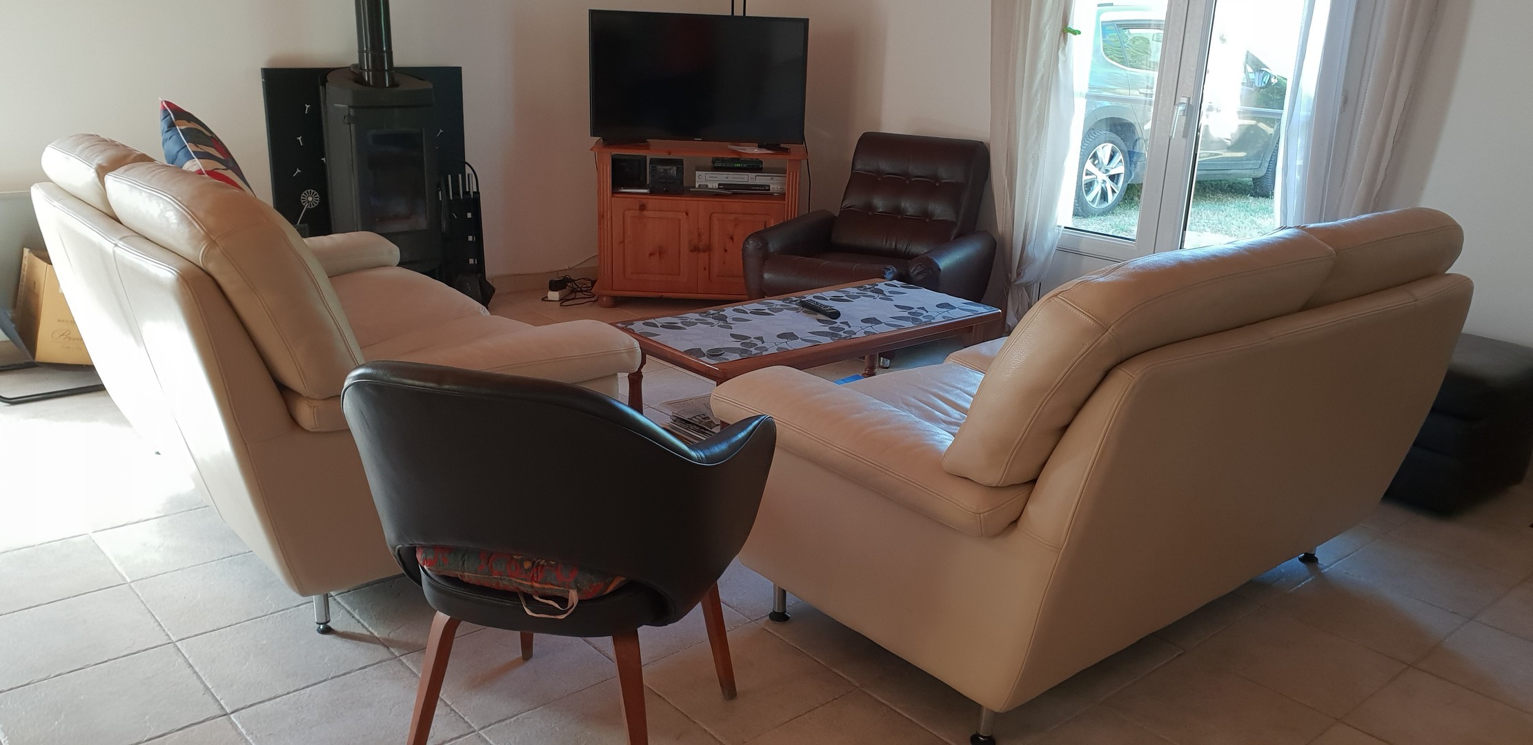 Séjour 38m2, Salle à manger; salon 2 canapés cuir, fauteuils; TV écran plat; WiFi.