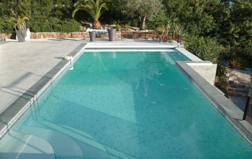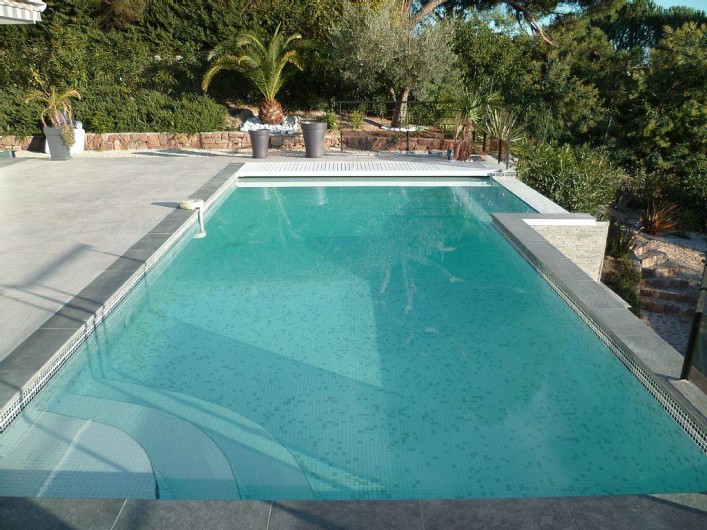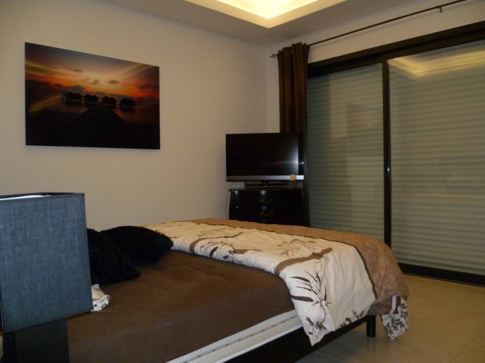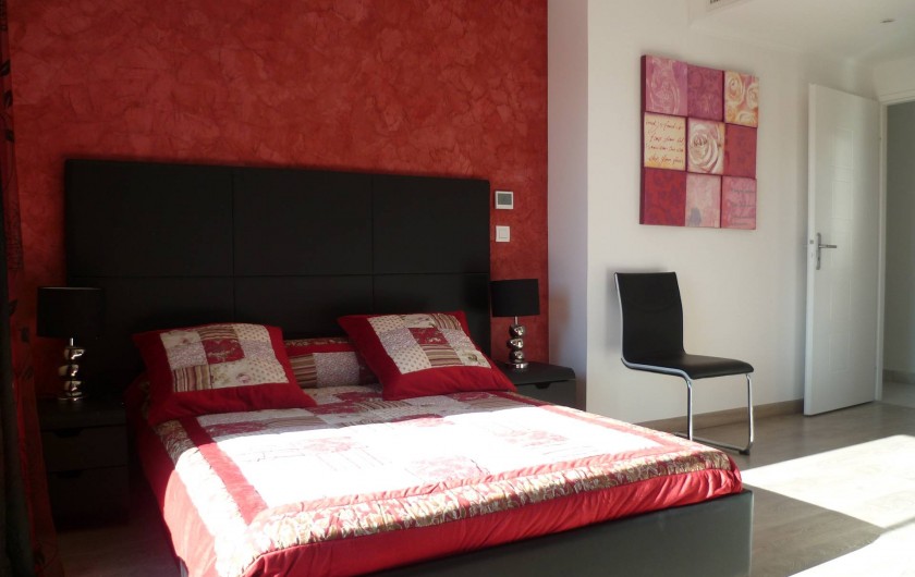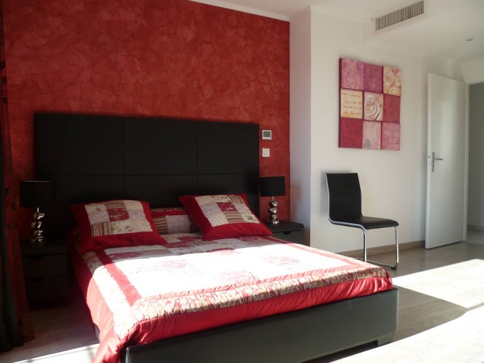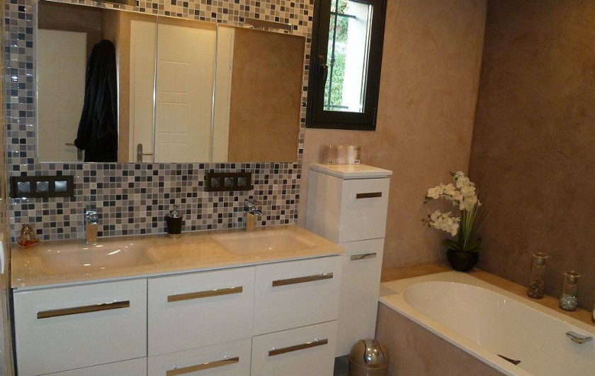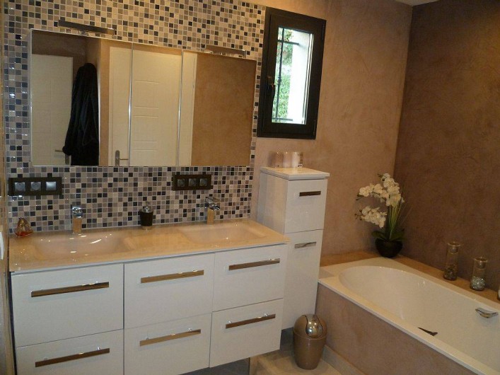 Grande chambre de Maître avec SDB (douche à l'italienne, baignoire et wc séparés). Toutes ces pièces ont une vue mer et donnent sur une grande terrasse et l'accès facile à la piscine. A l'extérieur, table et chaises pour 8 à 10 personnes, salon de jardin, transats, barbecue et plancha gaz, terrain de boules, baby-foot, tennis de table et banc de musculation.