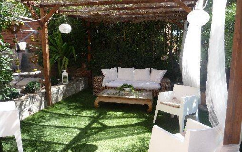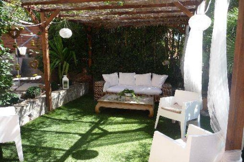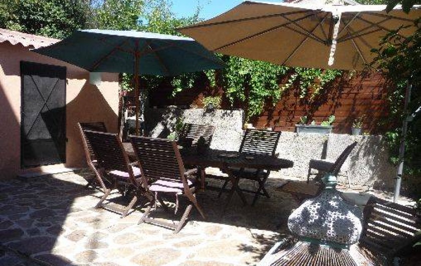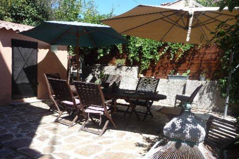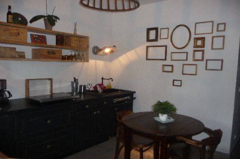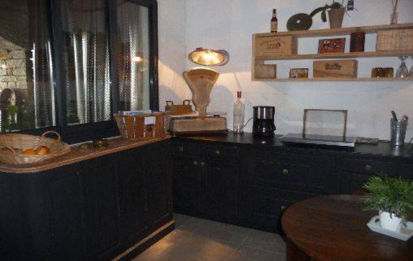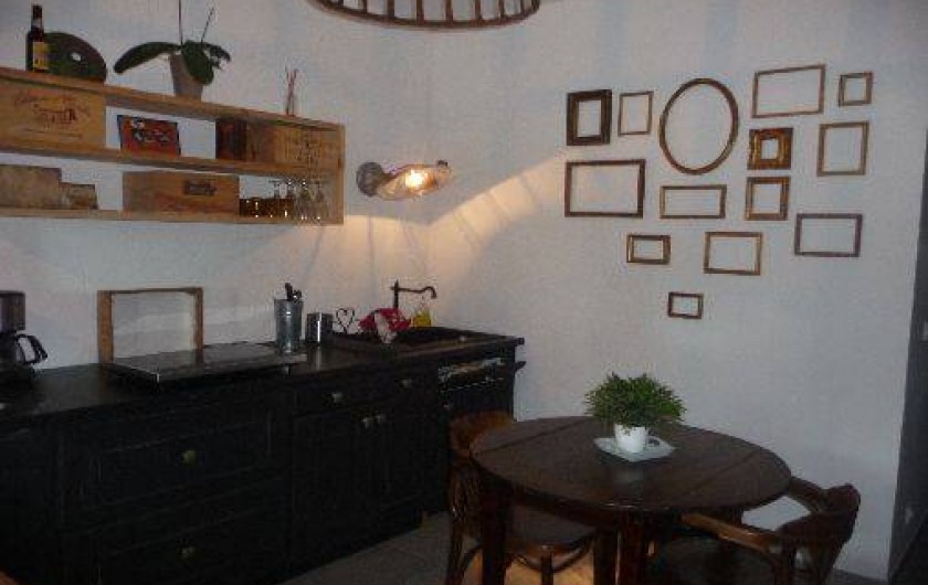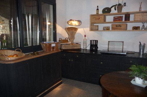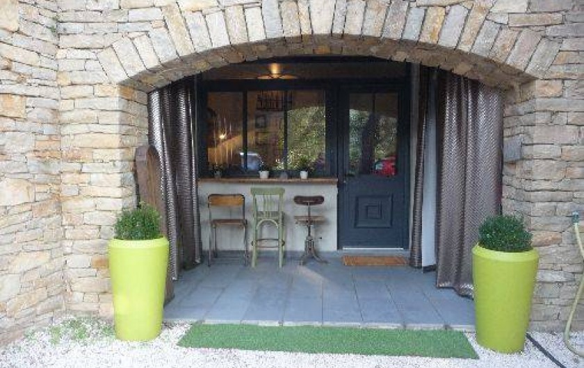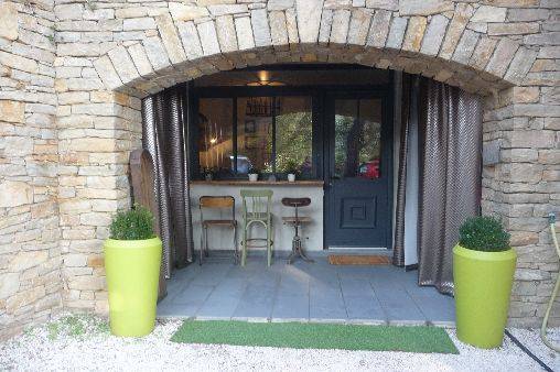 Cuisine équipée indépendante en rez de chaussée donnant sur une terrasse en pierre avec jardin zen sous tonnelle.