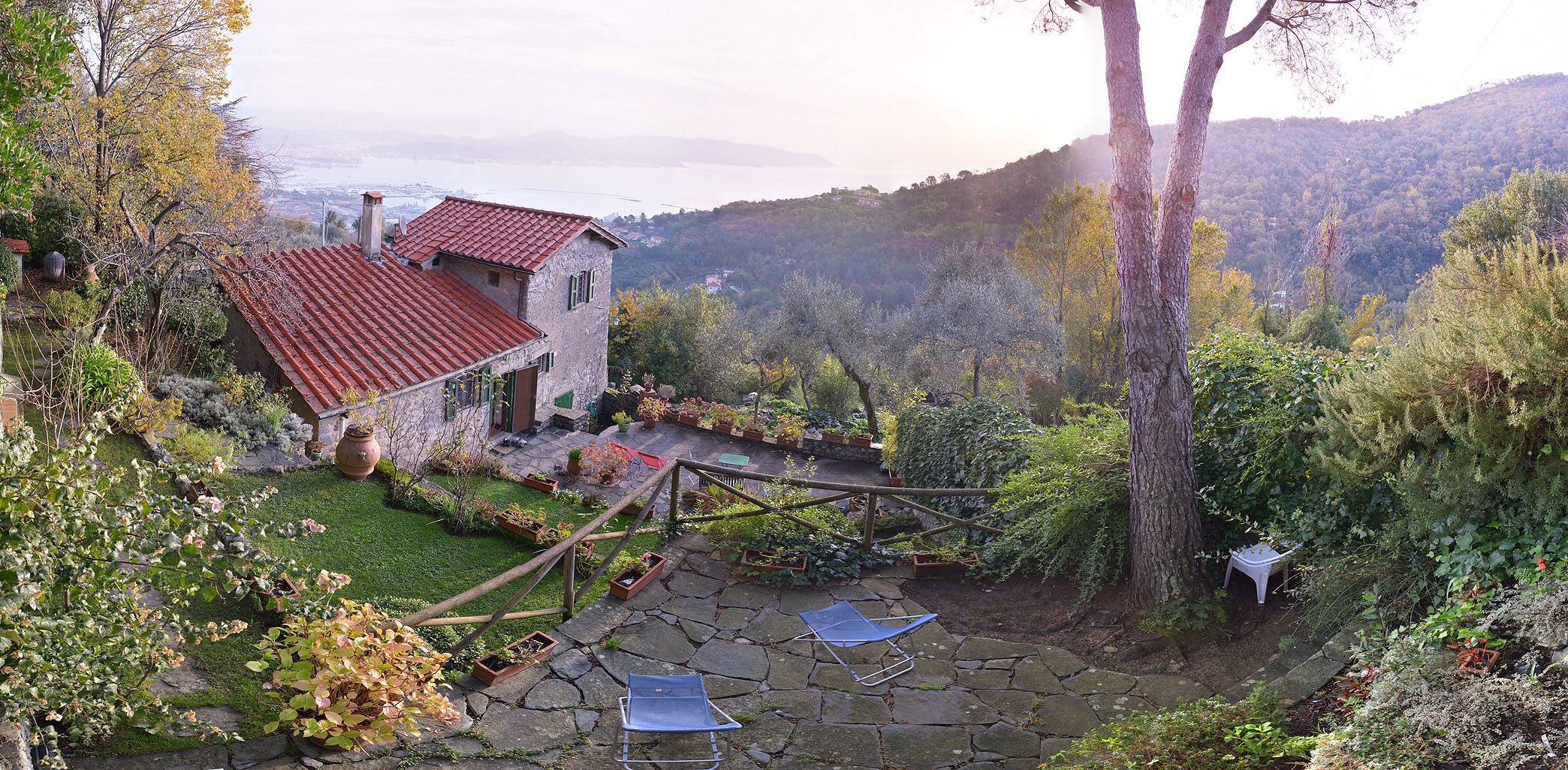 La Villa des Mûres repose sur une colline surplombant la mer à une hauteur de 300 mètres, avec une vue incomparable sur le golf de La Spezia. La propriété qui couvre 1500 mètres carré est encerclée par le maquis méditerranéen et des oliviers et est aussi la dernière villa d’un petit village, ce qui garantit une certaine tranquillité sans être isolé.