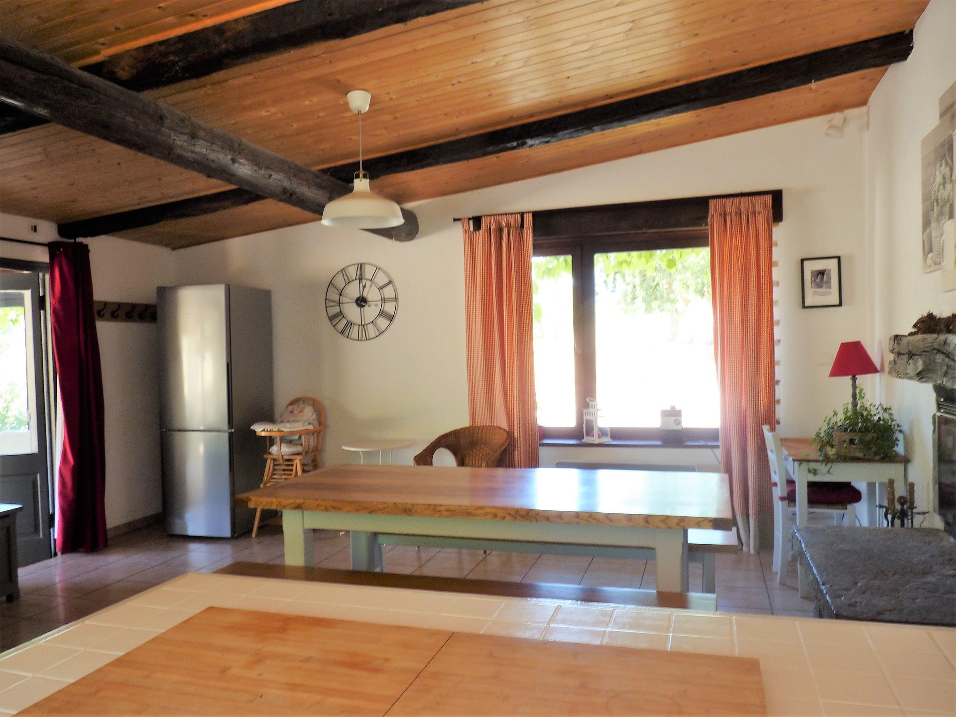 Sud Ardèche, 15 kms de Vallon Pont d'Arc où vous pourrez visiter la Caverne du Pont d’Arc, loue maison indépendante en pierres de pays 155 m2 de 4/ 8 adultes + 1 bébé maximum. La maison se situe en pleine nature sur un parc de 14 hectares, partagé entre un autre gîte et la maison du propriétaire (pas de route à proximité). Le gîte « l’orée du bois » convient aux personnes