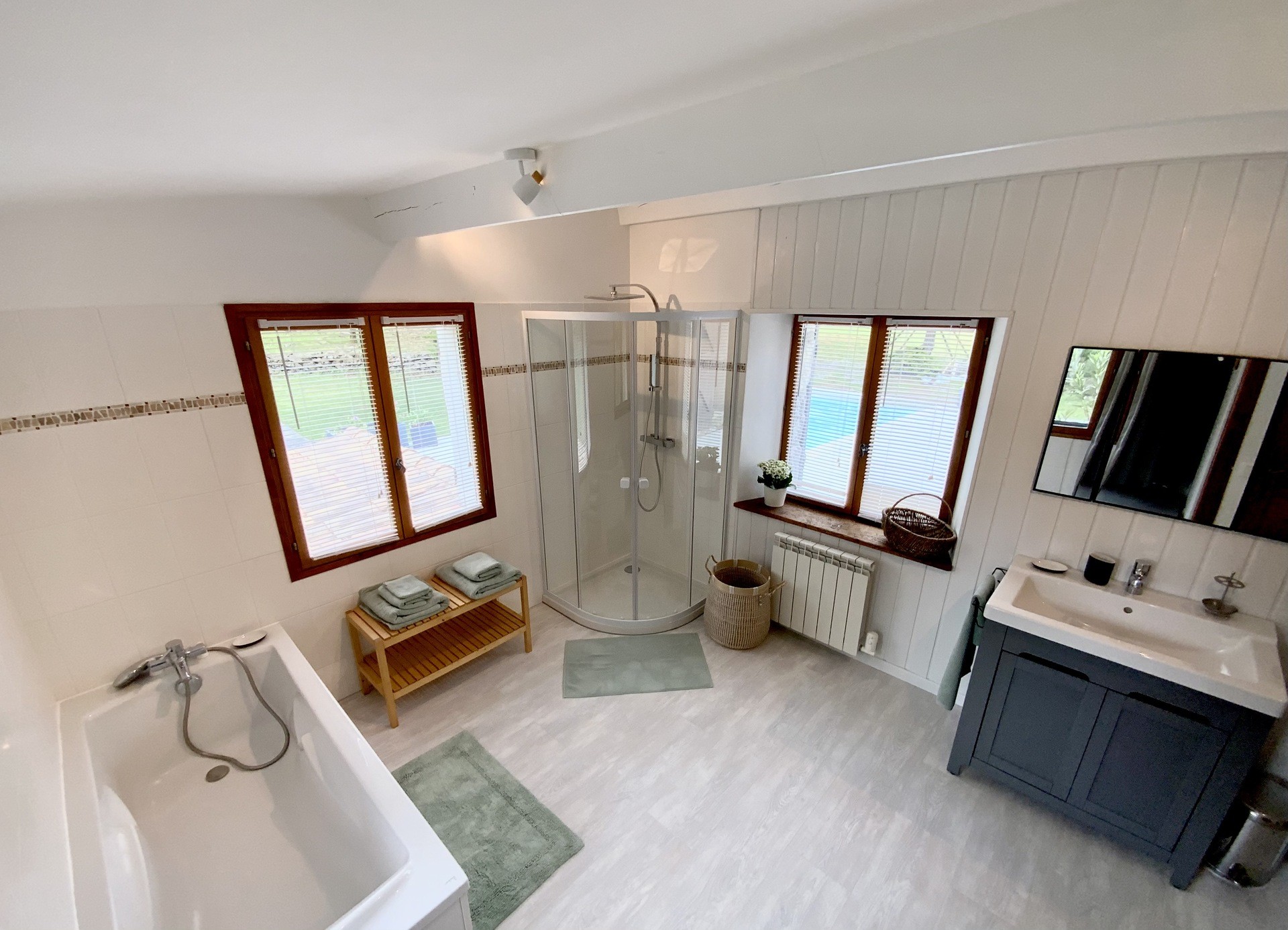 Tout confort. Idéale Maison de plain pied, 4 chambres dont une suite, 3 salles de bain, 3WC, grande terrasse couverte de 30 m2 pour profiter de l'ombrage. Une bibliothèque adultes et enfants est à votre disposition pour se détendre au coin de l’une des deux cheminées de la maison. WIFI. Ecran plat avec un lecteur bluray.