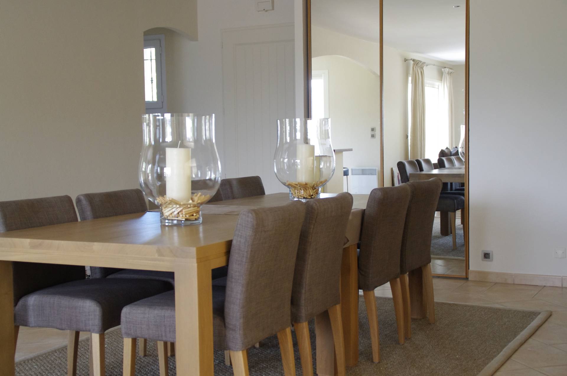 L'entrée s'ouvre sur la salle à manger et le salon qui donne sur les terrasses et la piscine. La cuisine toute équipée est ouverte sur le séjour, et a un accès sur la terrasse.