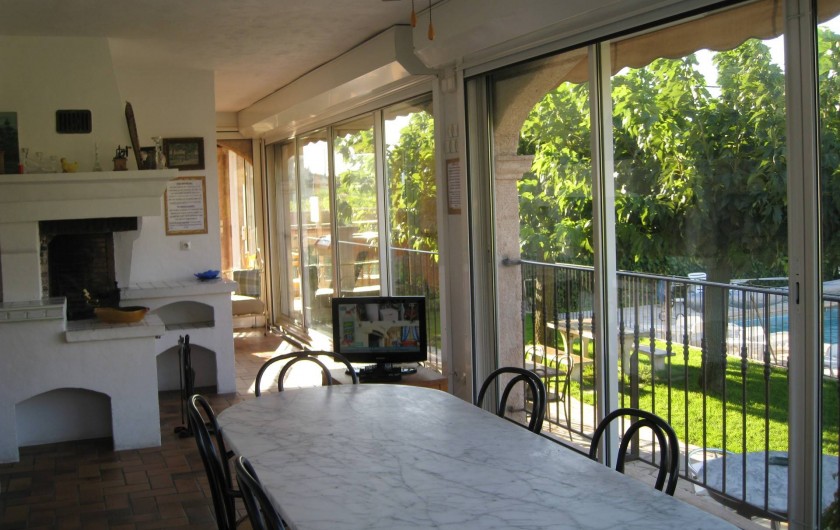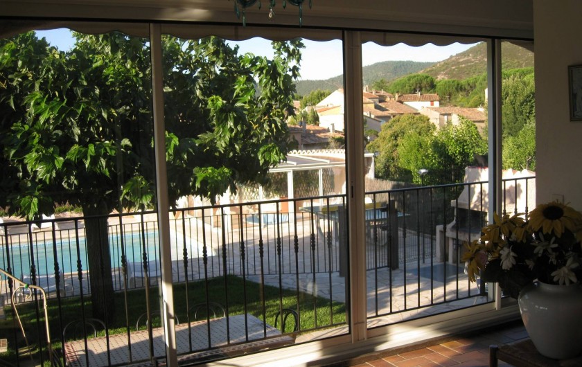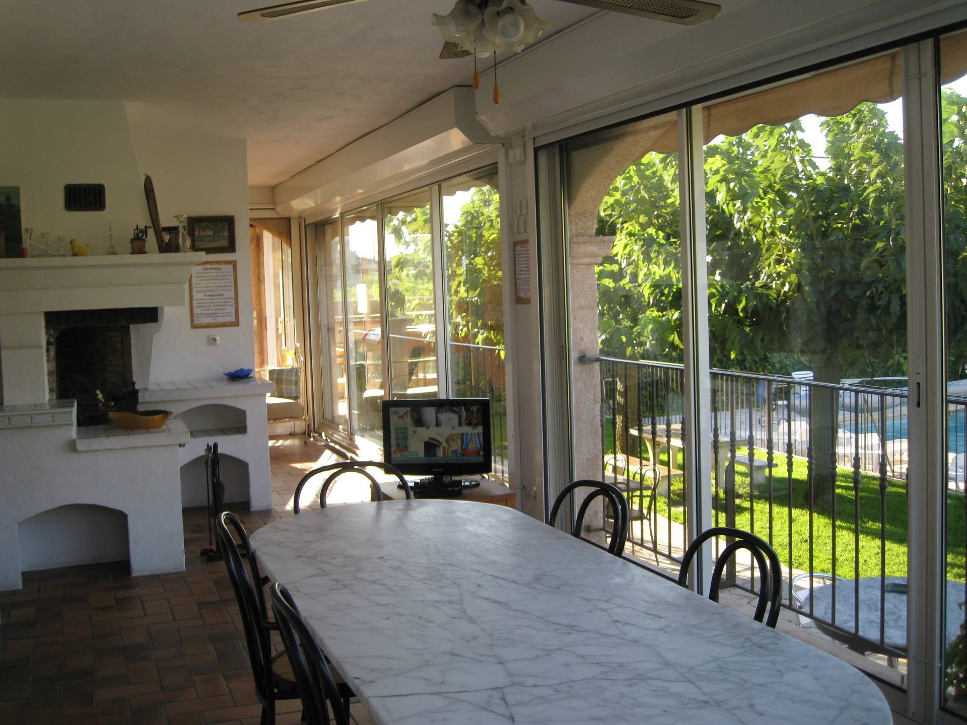 Le séjour avec TV est éclairé par de grandes baies vitrées coulissantes, avec vue dégagée sur la piscine, le village, les vignes et les