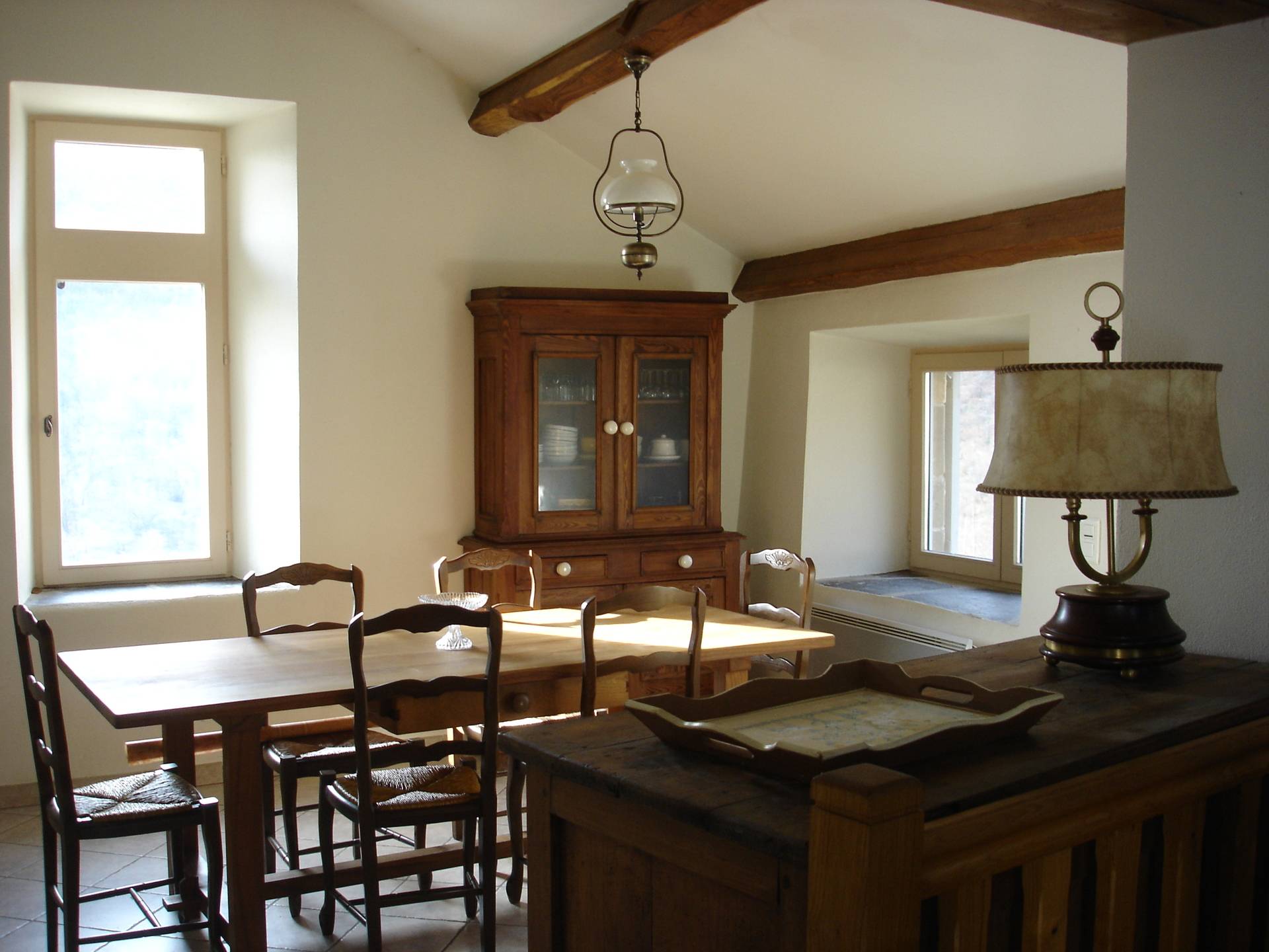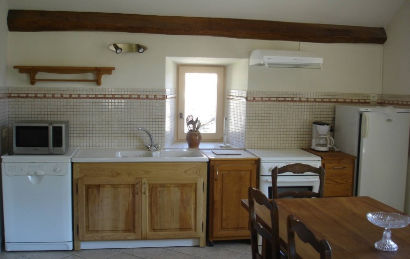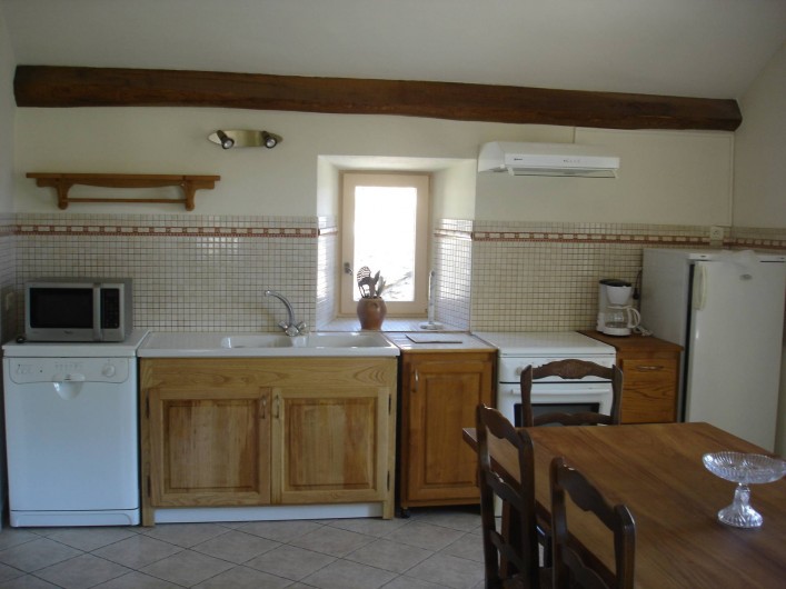 Côté cuisine/salle à manger une grande table de ferme et tout l'équipement électro-ménager : frigidaire, congélateur, gazinière, four, micro-ondes, lave vaisselle.