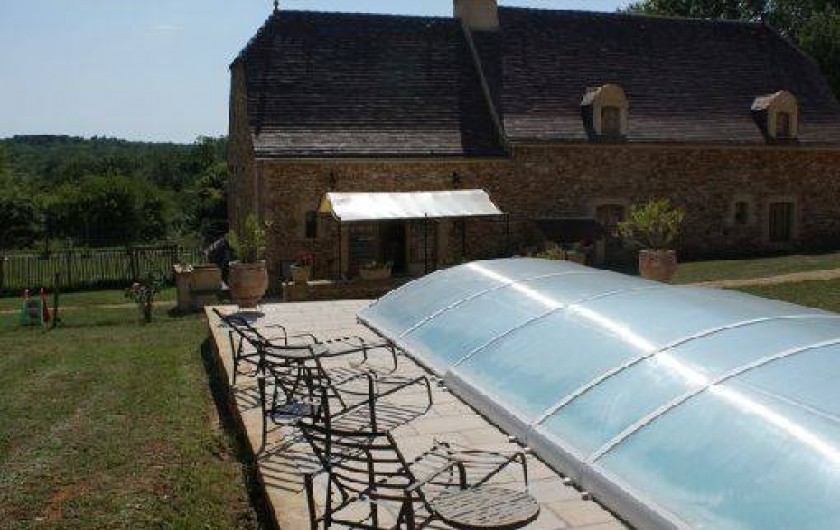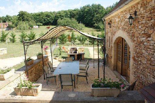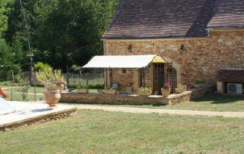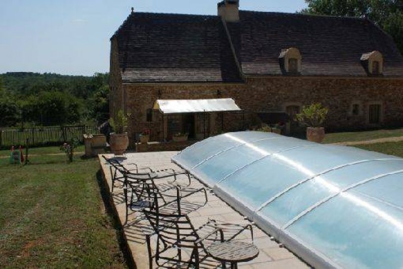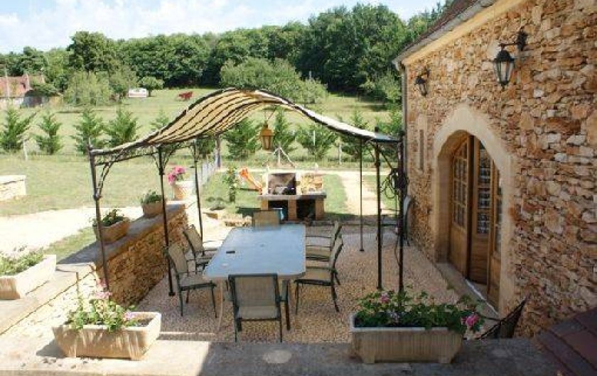 l'extérieur 2 terrasses avec tables et chaises dont une face à la piscine et couverte d'une pergola et possédant un barbecue.Terrain entièrement clôturé
