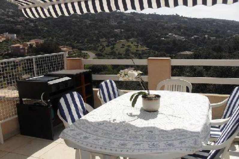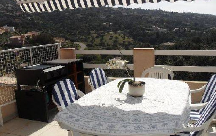 de 10m2 plein sud :plancha, une table, 6 fauteuils.