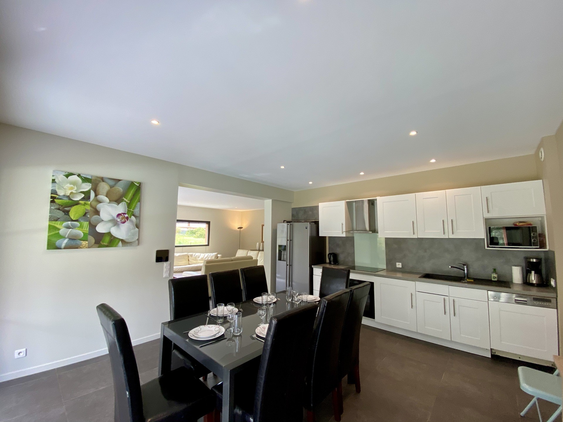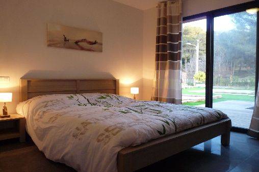 la villa est neuve sur terrain de 900 m² avec 4 chambre en REZ DE JARDIN, et cuisine-repas donnant directement sur les terrasses et piscine