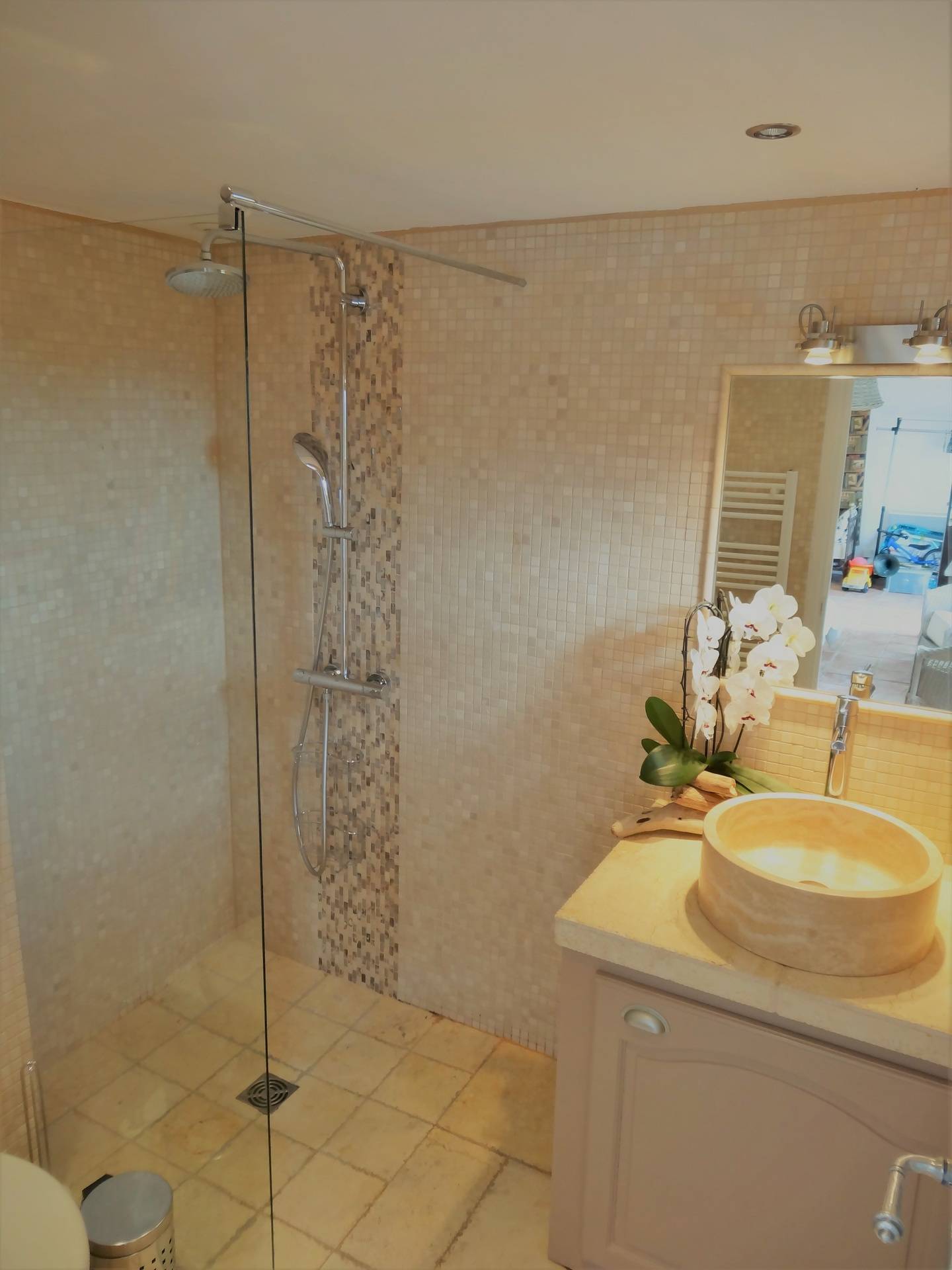 Au niveau inférieur, piscine chauffée 10 x 4, studio climatisé avec sa salle d’eau.
