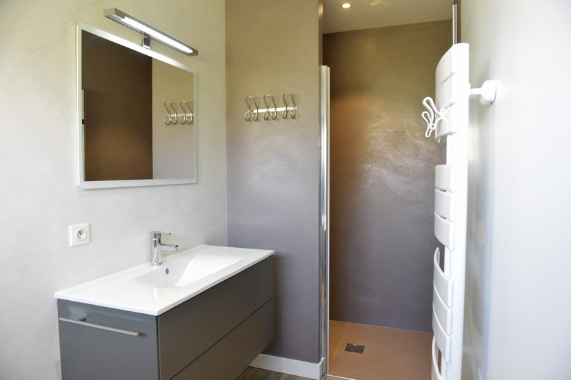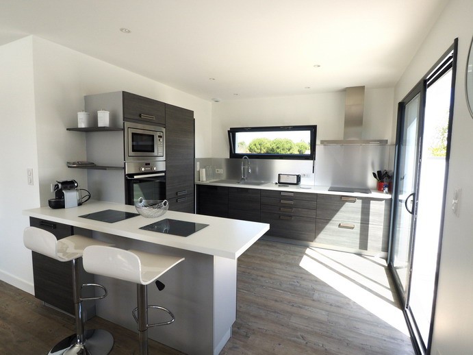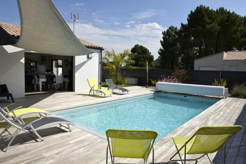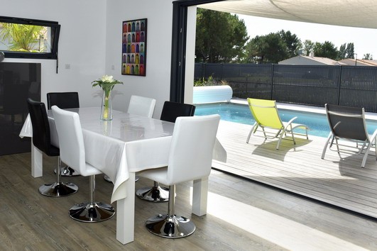 C'est une maison récente contemporaine avec piscine privée, chauffée à 28° (du 15/06 au 30/09 ) et non partagée.