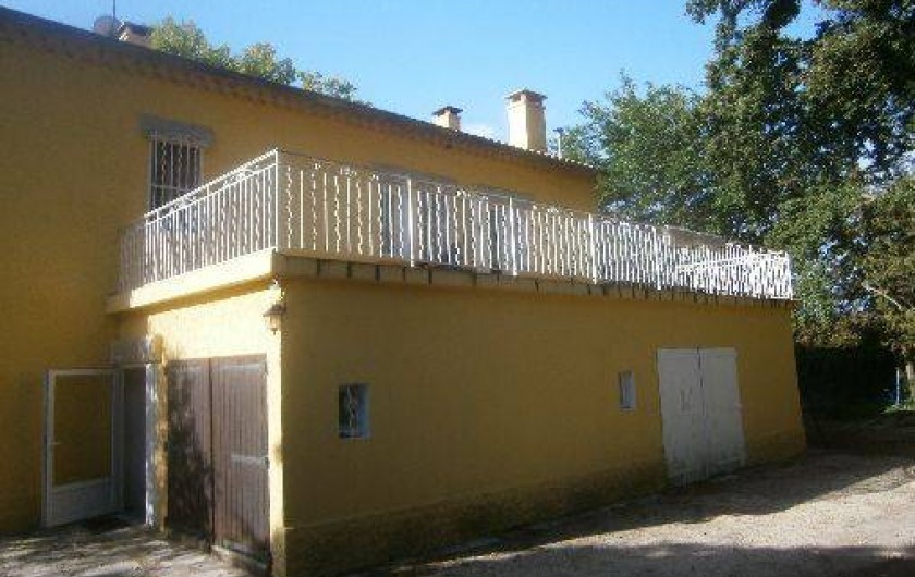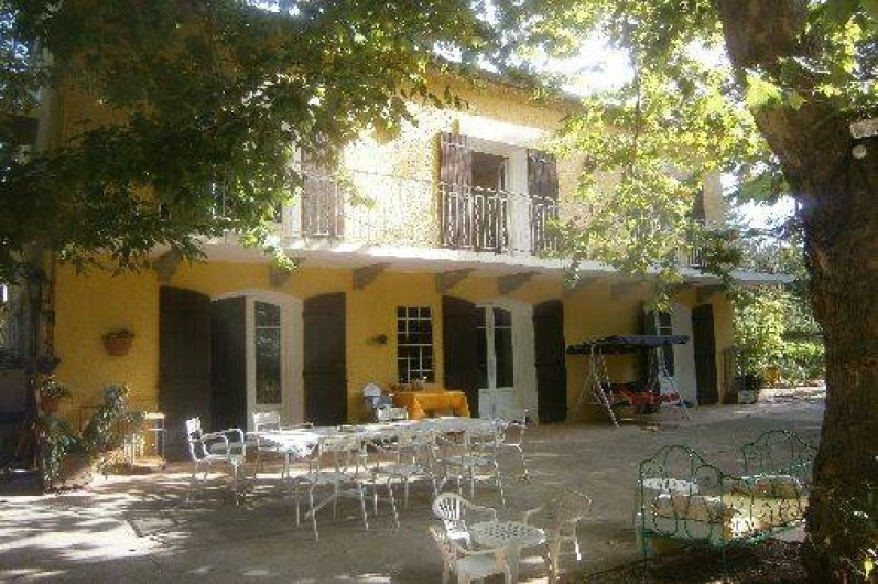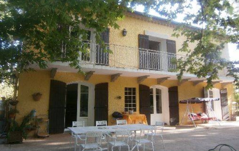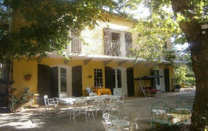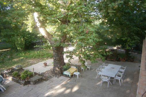 la maison est entourée d'arbres qui donnent une belle et généreuse ombre sur des terrasses entourant la maison.