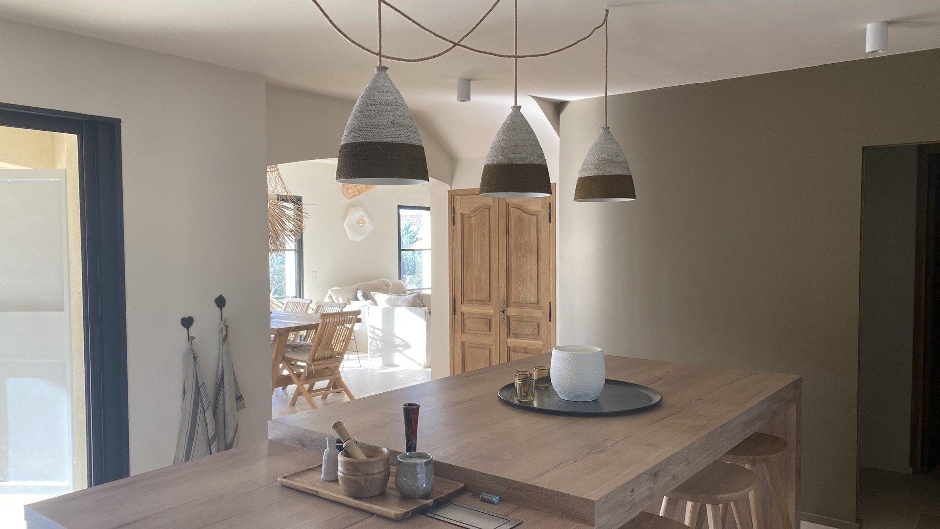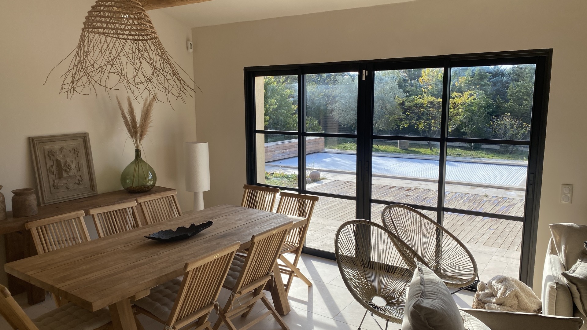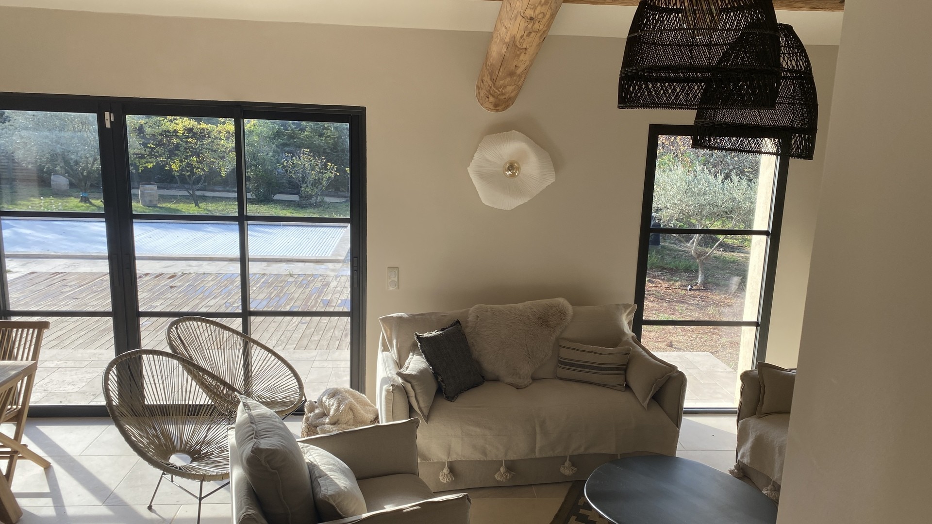 Le salon est illuminé par des pièces de vie avec de grandes baies, et la cuisine est largement ouverte sur la terrasse extérieure et couverte
