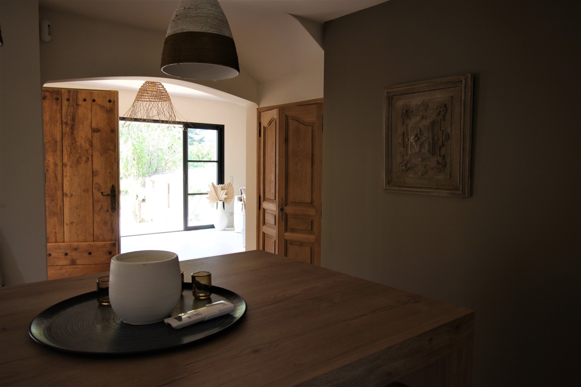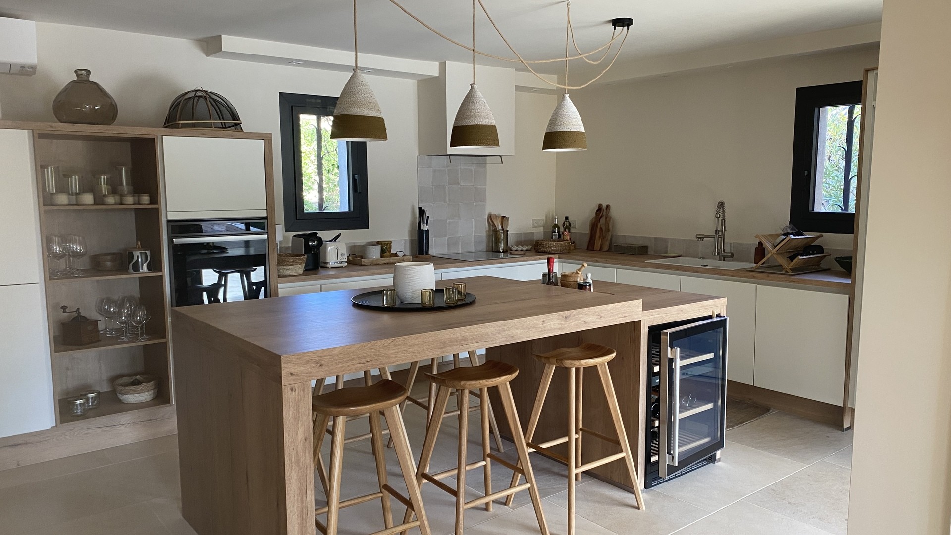 1 kitchen for your breakfasts, equipped with a Nespresso coffee machine, dishes, dishwasher, oven, microwave, central island, wine cellar (wine for sale), fridge, and freezers in the laundry room, bar stool