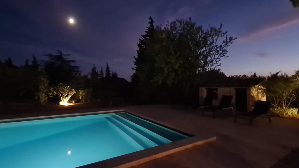 1 salon, TV, détente, grande baie vitrée donnant sur la terrasse extérieure, vue sur le jardin (éclairée), piscine sécurisée