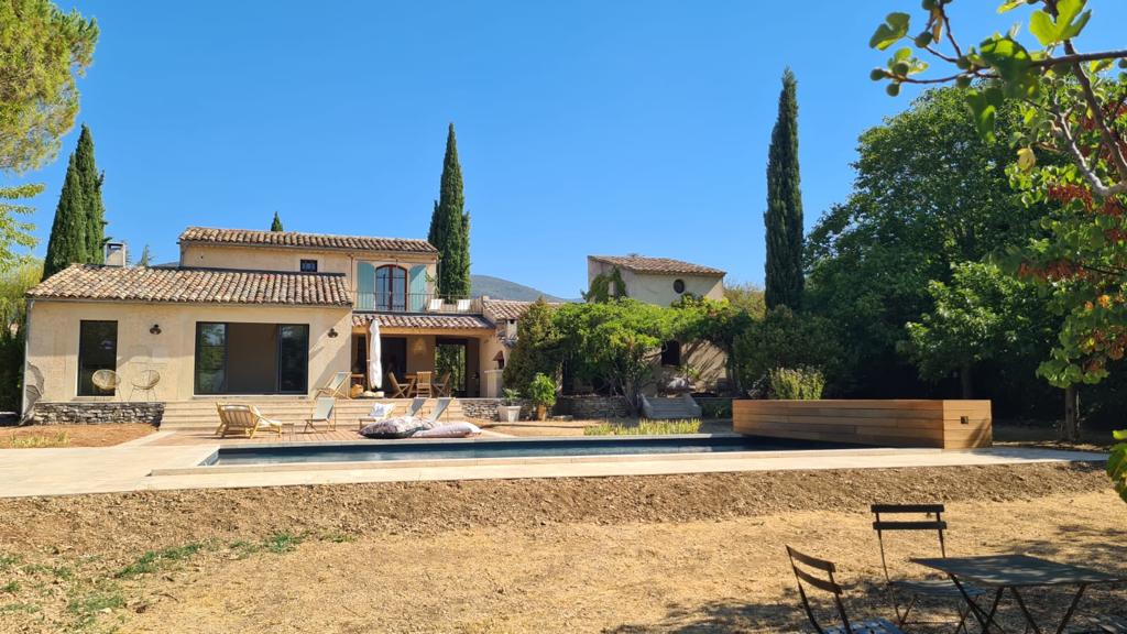Belle terrasse ombragée avec un salon de jardin avec une vue sur le jardin et piscine.