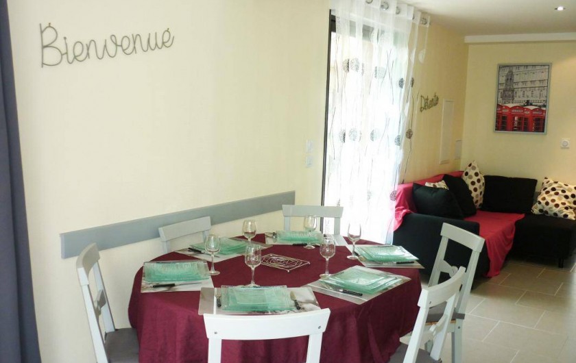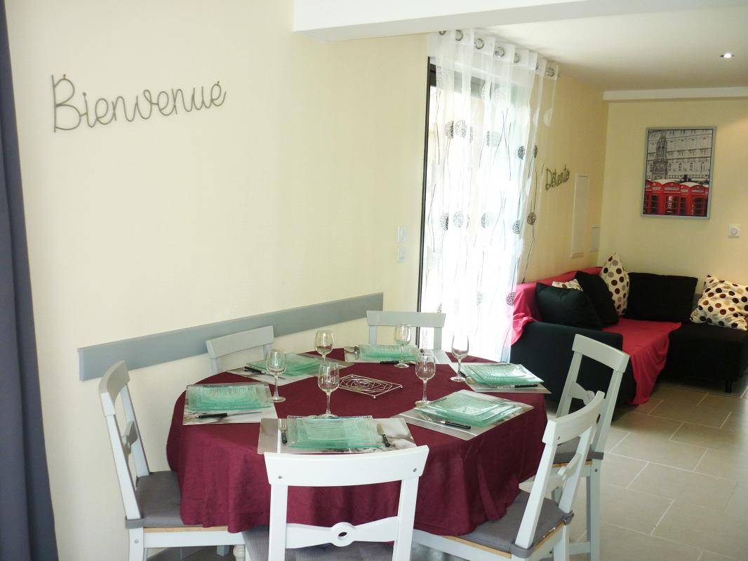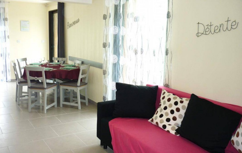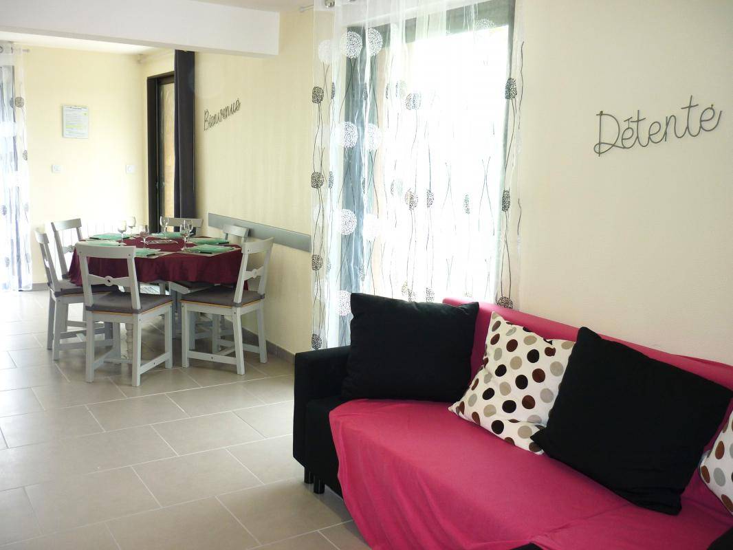 Gîte indépendant dant la propriété. Rez-de-chaussée : séjour avec espace salon (canapé) et cuisine aménagée, 1 chambre 2