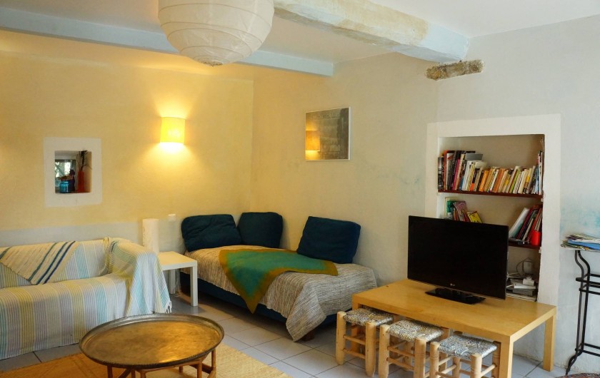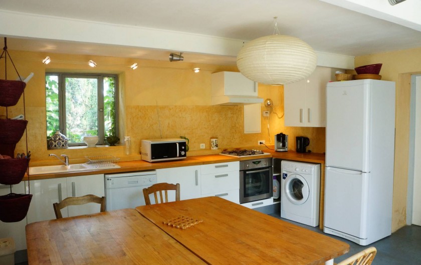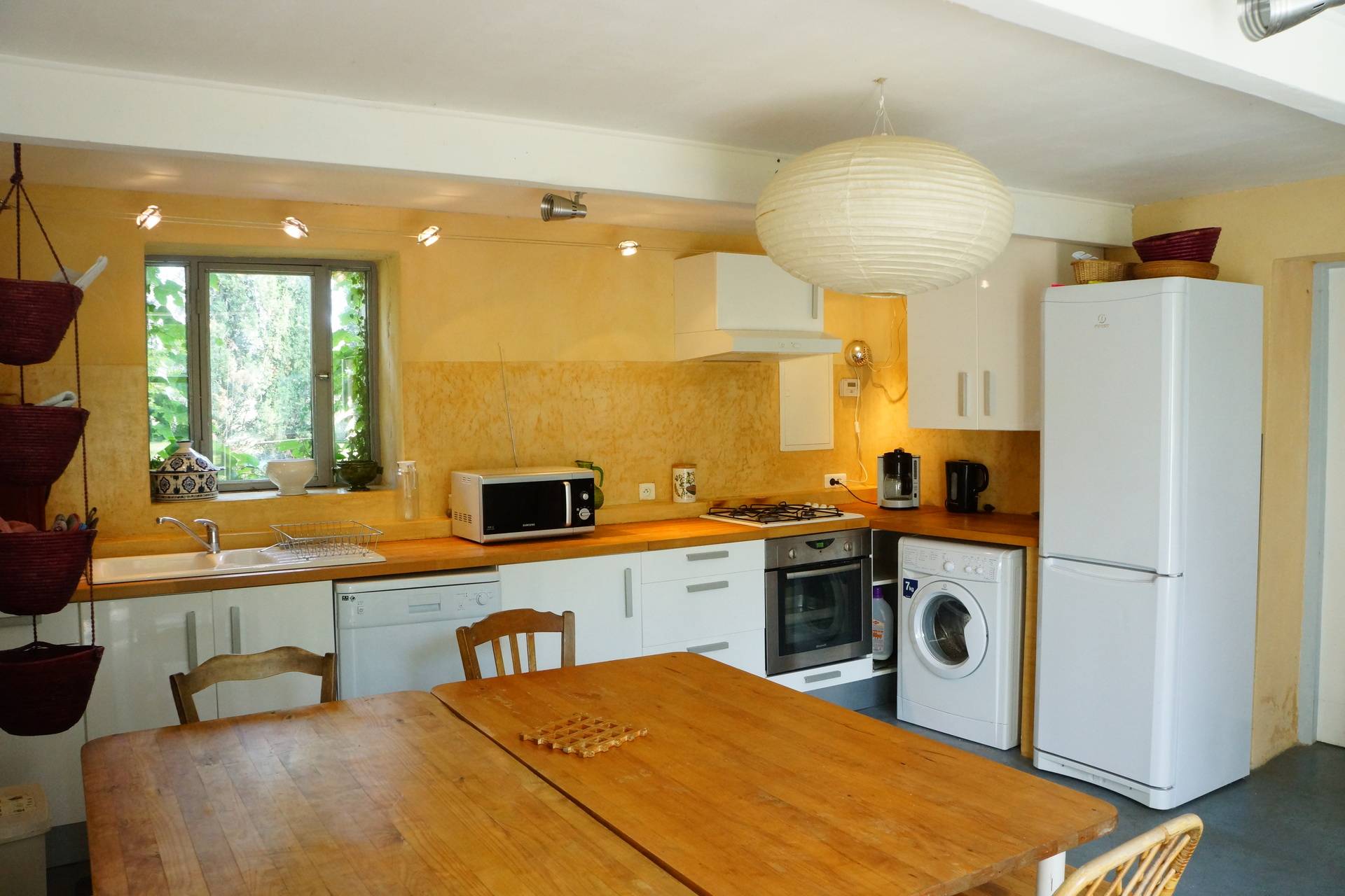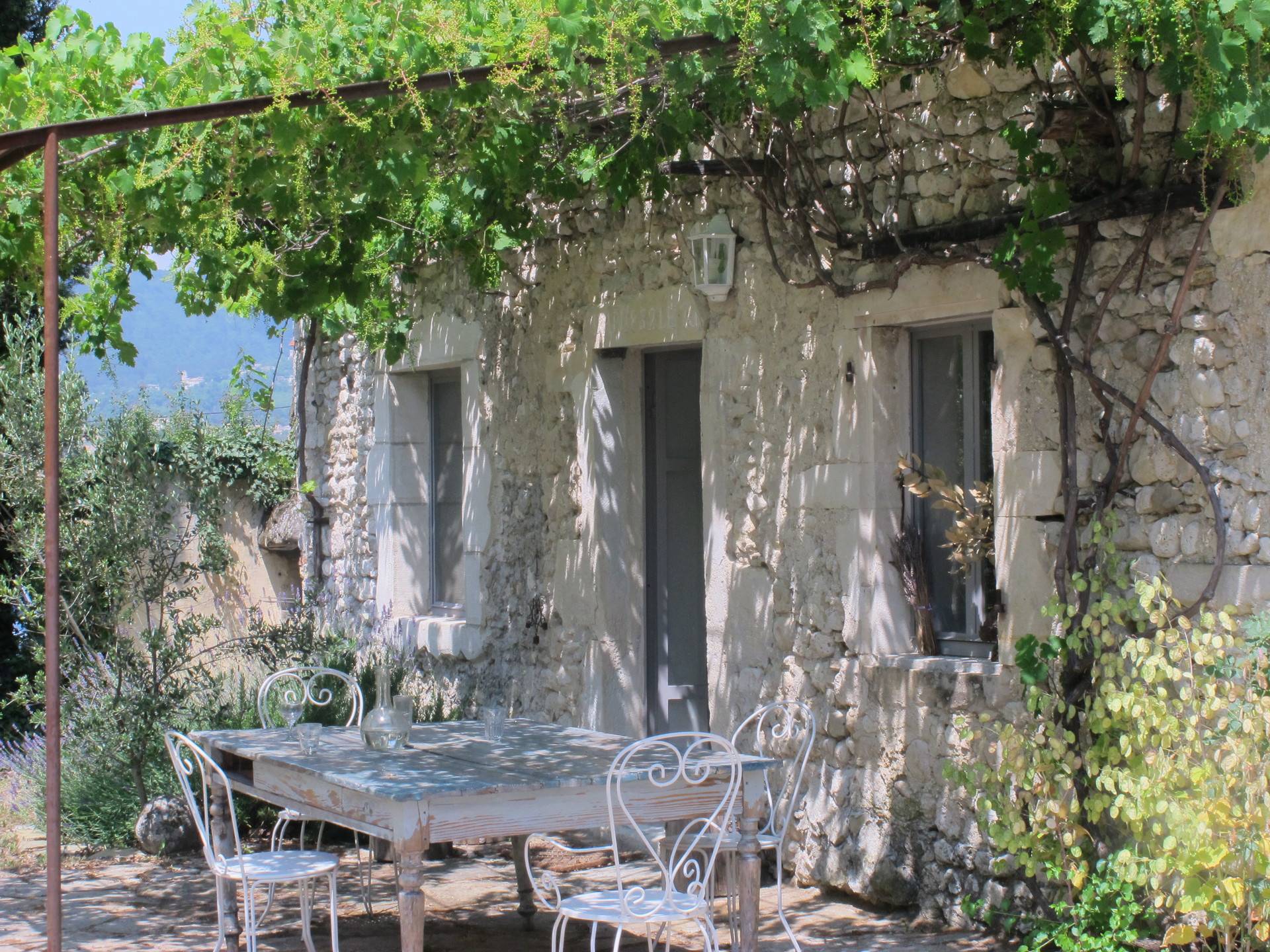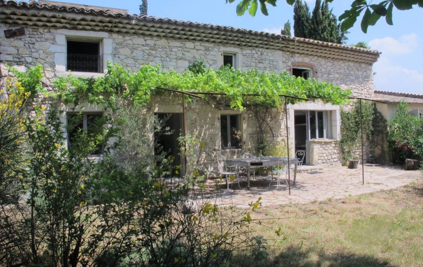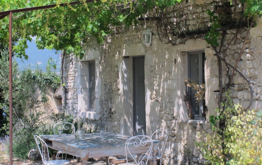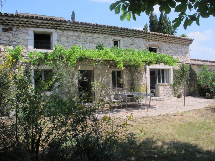 Une terrasse conviviale en pierre dallée, prolonge l'intérieur. Elle est accessible directement par des portes fenêtre depuis la cuisine, depuis le salon, et la chambre 1. Elle vous accueillera tout au long de la journée, que ce soit pour les repas autour d'une grande table en bois réunissant 10 personnes, sous sa treille de vigne ombragée.