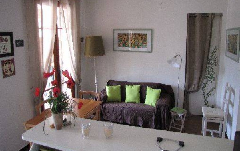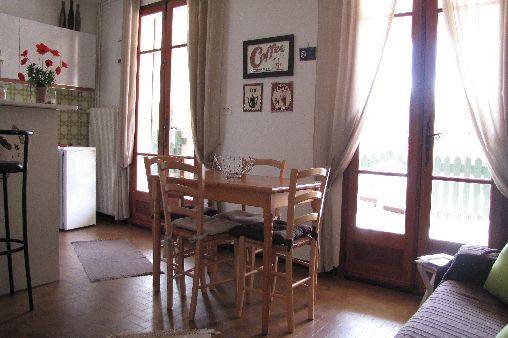 La salle de séjour avec cuisine américaine et coin salon ouvre sur la terrasse et le jardin par deux portes fenêtres en plein sud.Son équipement est complet et neuf .La propriété est fermée par un portail