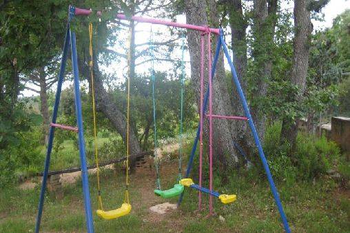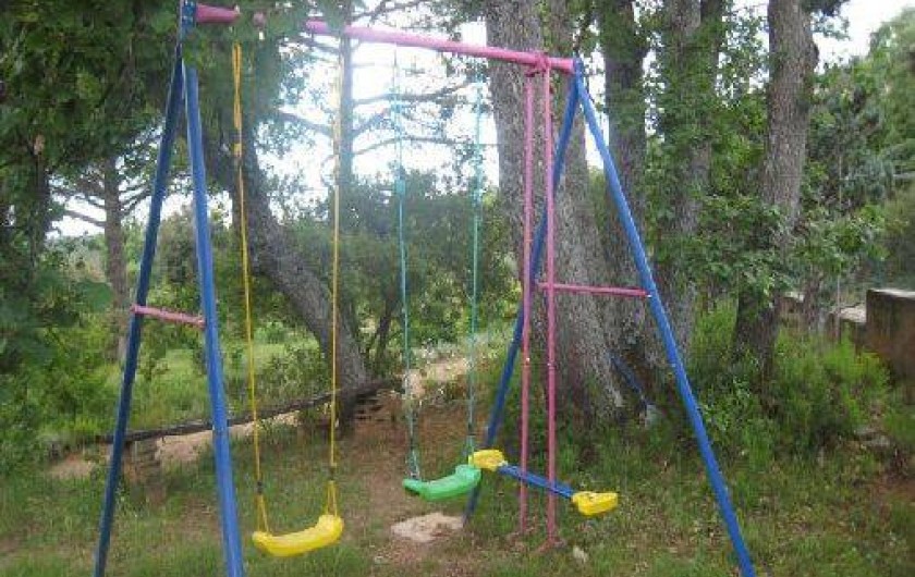 Terrain pour jeux de boules, balançoire, tobogan pour enfants.