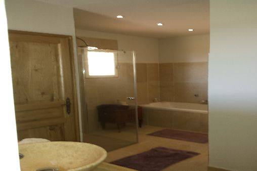 La chambre de maître a sa propre salle de bains et son propre terrasse couvert.La salle de bains a un double vasque,un toilette séparé , un douche à l'Italienne et un bain.