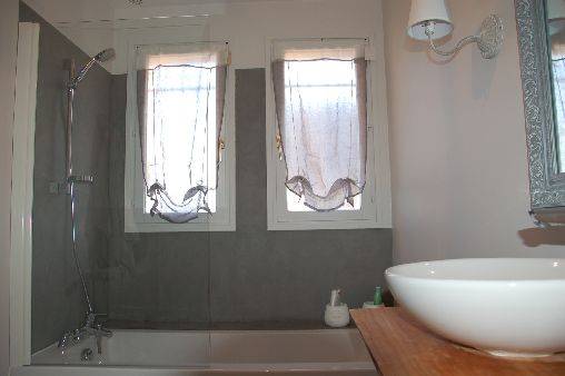 La décoration mêle la modernité des matériaux (béton ciré ,tadelak ) aux matériaux bruts que l on retrouve dans les lampes, table basse ou chevets faits de morceaux de bois, ou de vieilles poutres retrouvées sur place.