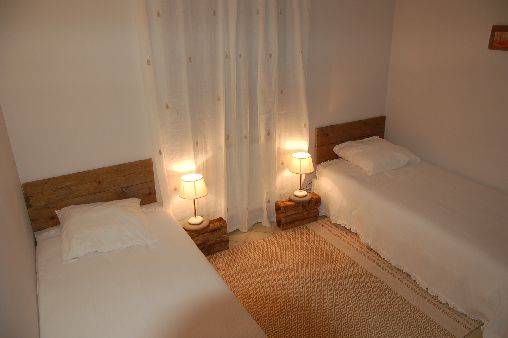 La maison dispose de deux chambres avec un lit double et une chambre avec deux lits simples .