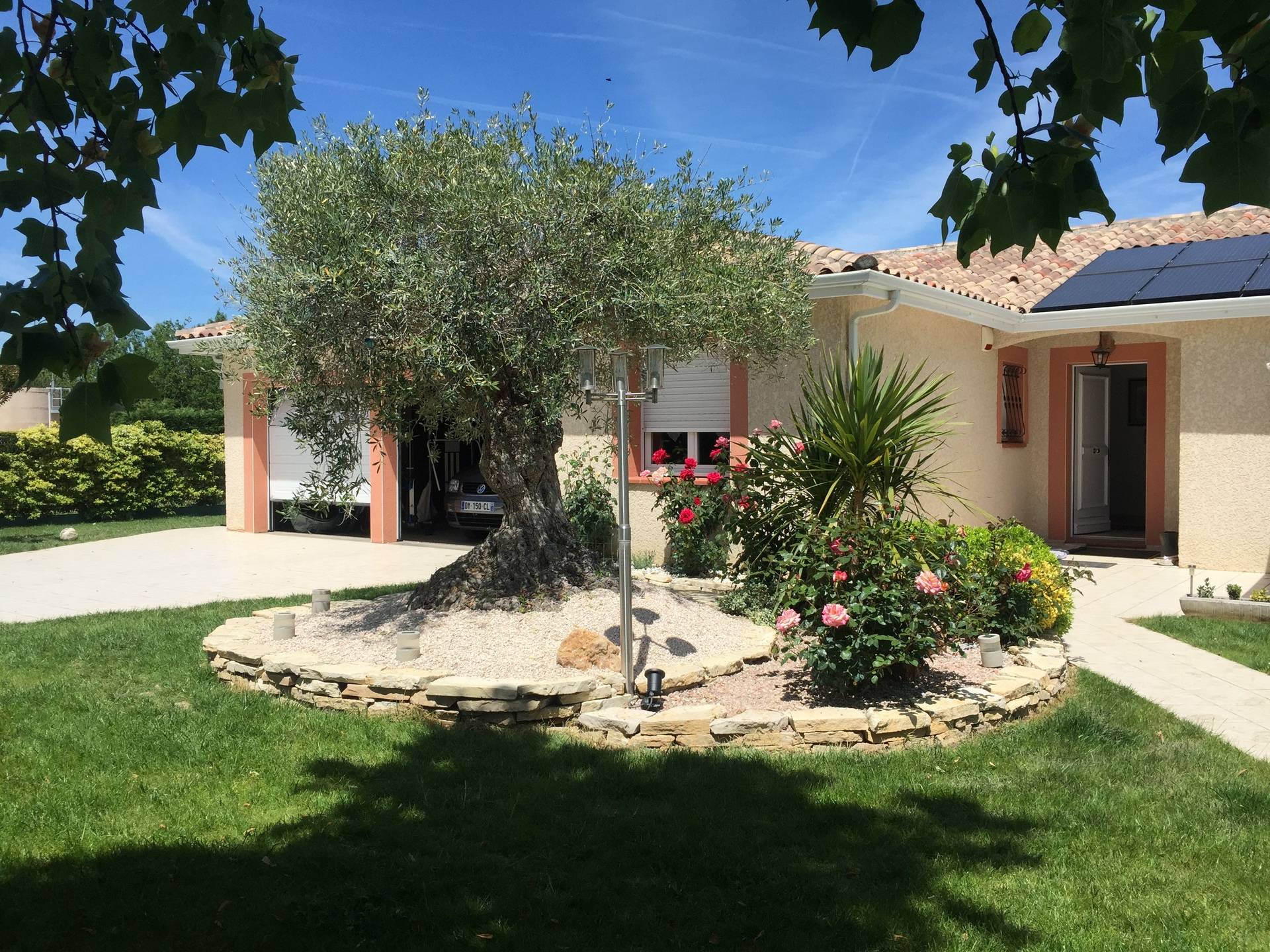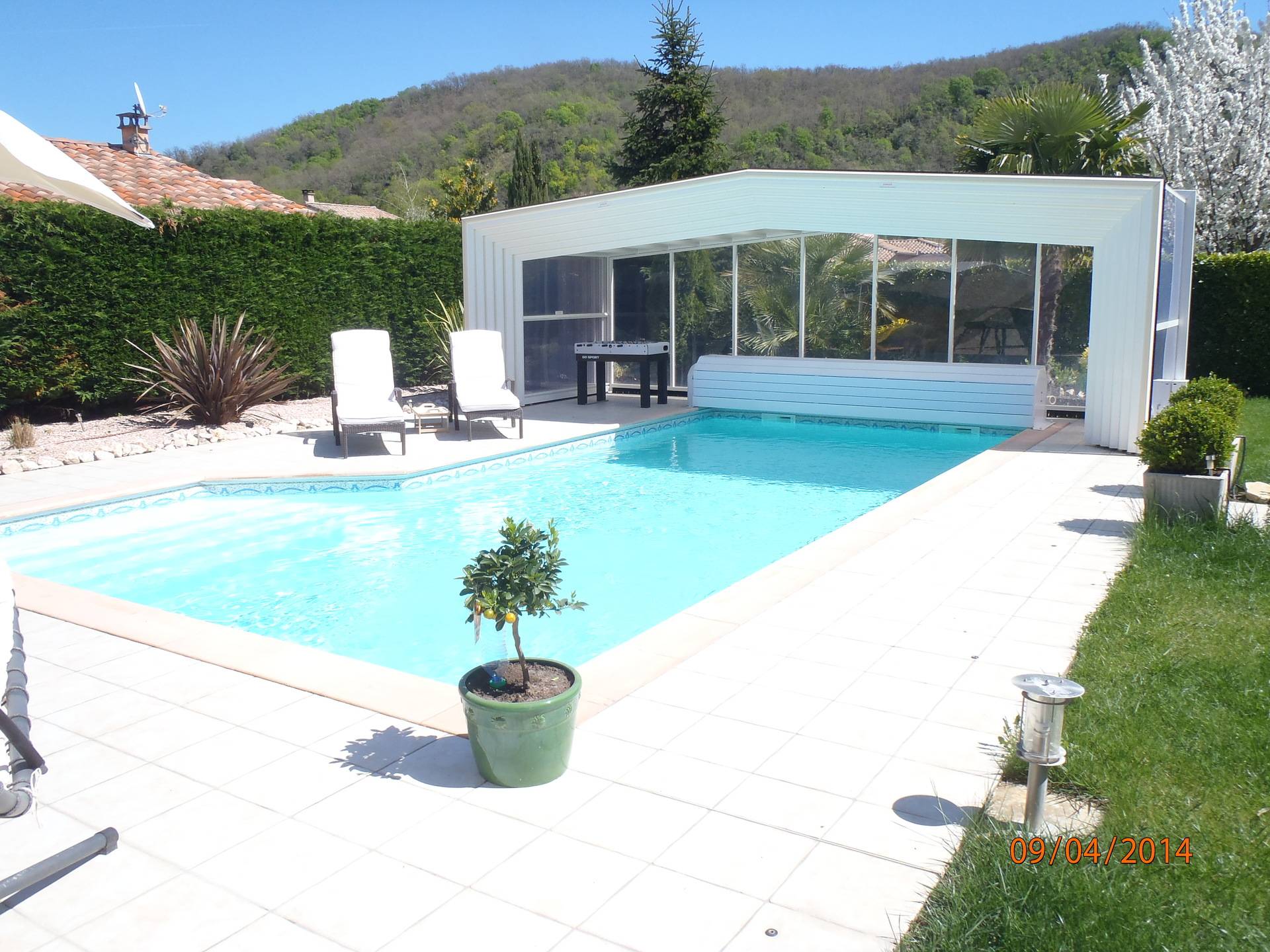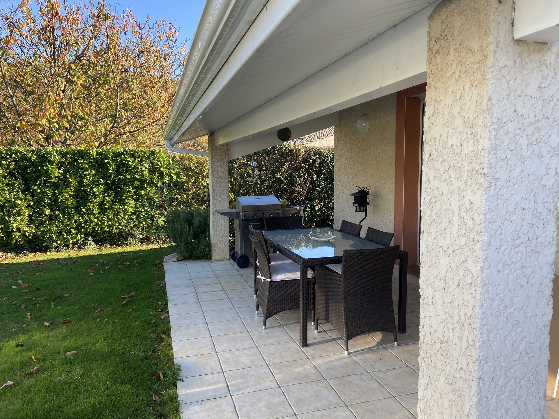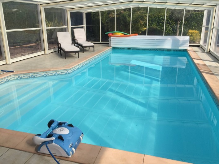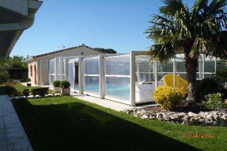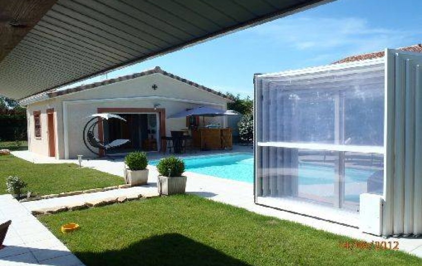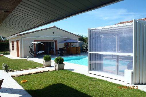 Je loue ma résidence principale pendant mes absences; maison de plein pied, avec garage, trois chambres et grand salon salle à manger, une salle de bain dans la maison, une seconde salle de bain dans la dépendance avec le spa et le sauna. La piscine est couverte par un abri haut, qui peut rester fermer ou s'ouvrir suivant les conditions météo, elle est chauffée par une pompe à chaleur et le traitement automatique est au brome.