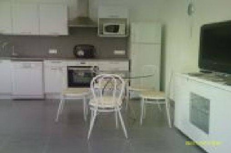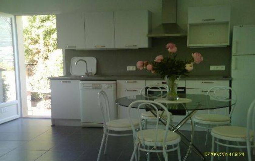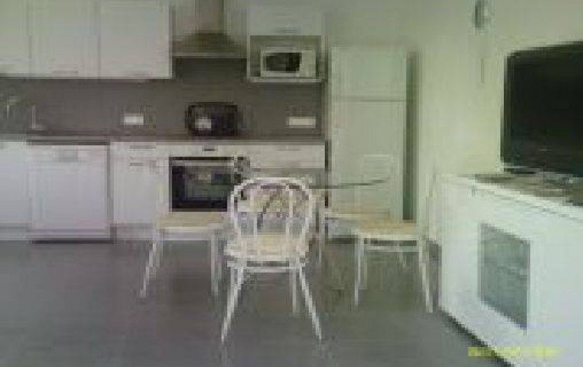 Pièce principale : climatiseur réversible, table ronde en verre et 5 chaises, buffet, télévision, lecteur de DVD, cuisson tout électrique : plaque vitrocéram, four, lave vaisselle, micro-onde, réfrigérateur-congélateur, hotte aspirante.