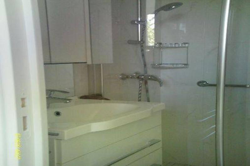 Salle de douche à l'italienne, meuble lavabo miroir, radiateur. WC