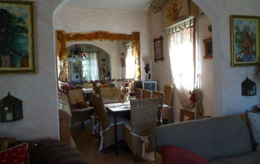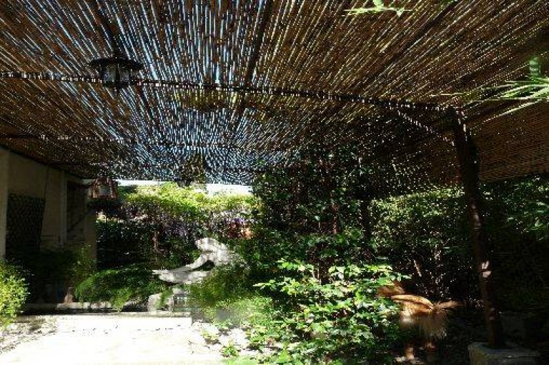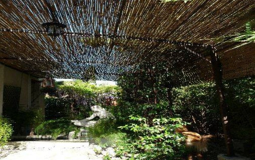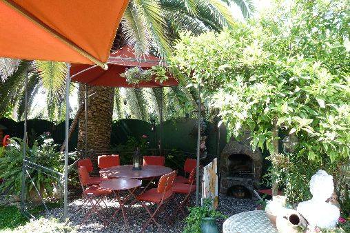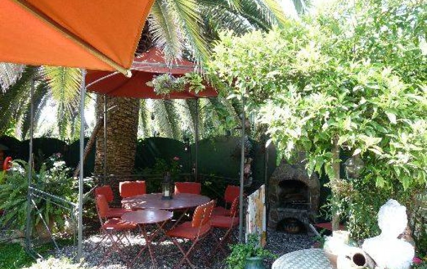 sous la tonnelle en fer forgée à l'ombre d'un palmier, avec barbecue en pierres réfractaires. Les transats permettent de bronzer au soleil ou de se reposer à l'ombre selon l'emplacement.En contrebas à l'ouest devant le studio, une terrasse avec table et chaiseset parasol, àcôté d'une petite buanderie contenant un congélateur, un lave linge et un sèche linge.Dans l'allée une tonnelle permet de garer plusieurs véhicules à l'abri.
