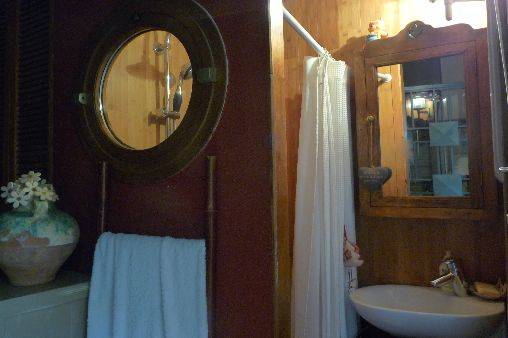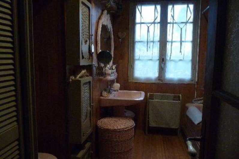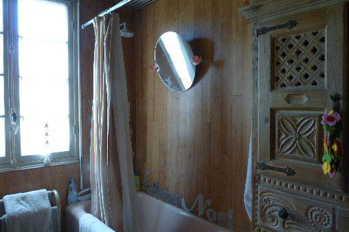 La salle de bain avec une fenêtre à l'ouest, est constituée d'une baignoire qui fait aussi office de douche, un lavabo et un WC comme sanitaires. Une armoire contient le linge de maison et la pharmacie, une petite penderie avec entre autres balaies et la planche à repasser.